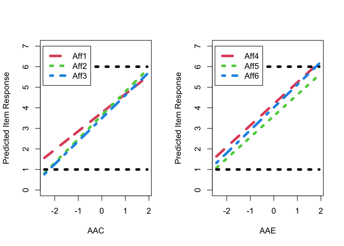 The resulting distribution of the EAP estimates of factor score as shown in Figure 1. Figure 2 shows the predicted response for each item as a linear function of the latent factor based on the estimated model parameters. As shown, for AAE factor, the predicted item response goes above the highest response option just before a latent factor score of 2 (i.e., 2 SDs above the mean), resulting in a ceiling effect for AAE factor, as also shown in Figure 1.
