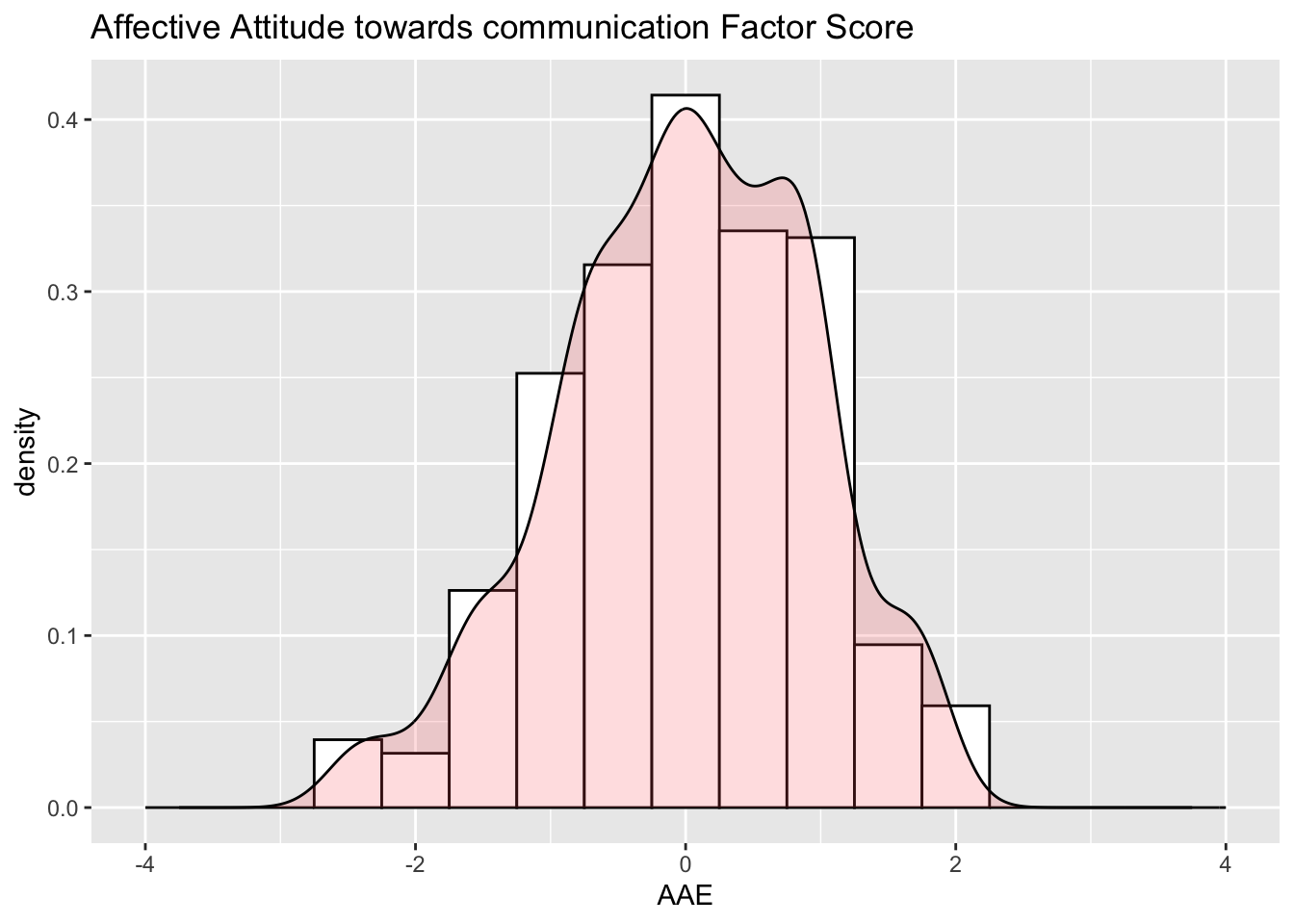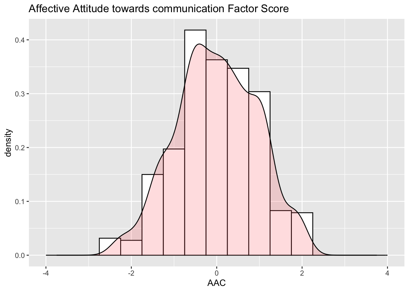 The AAC factor scores have an estimated mean of 0 with a variance of 0.88 due to the effect of the prior distribution. The SE for each person’s AAC factor score is 0.347; 95% confidence interval for AAC factor score is = . The AAE factor scores have an estimated mean of 0 with a variance of 0.881 due to the effect of the prior distribution. The SE for each person’s AAC factor score is 0.357; 95% confidence interval for AAC factor score is = .