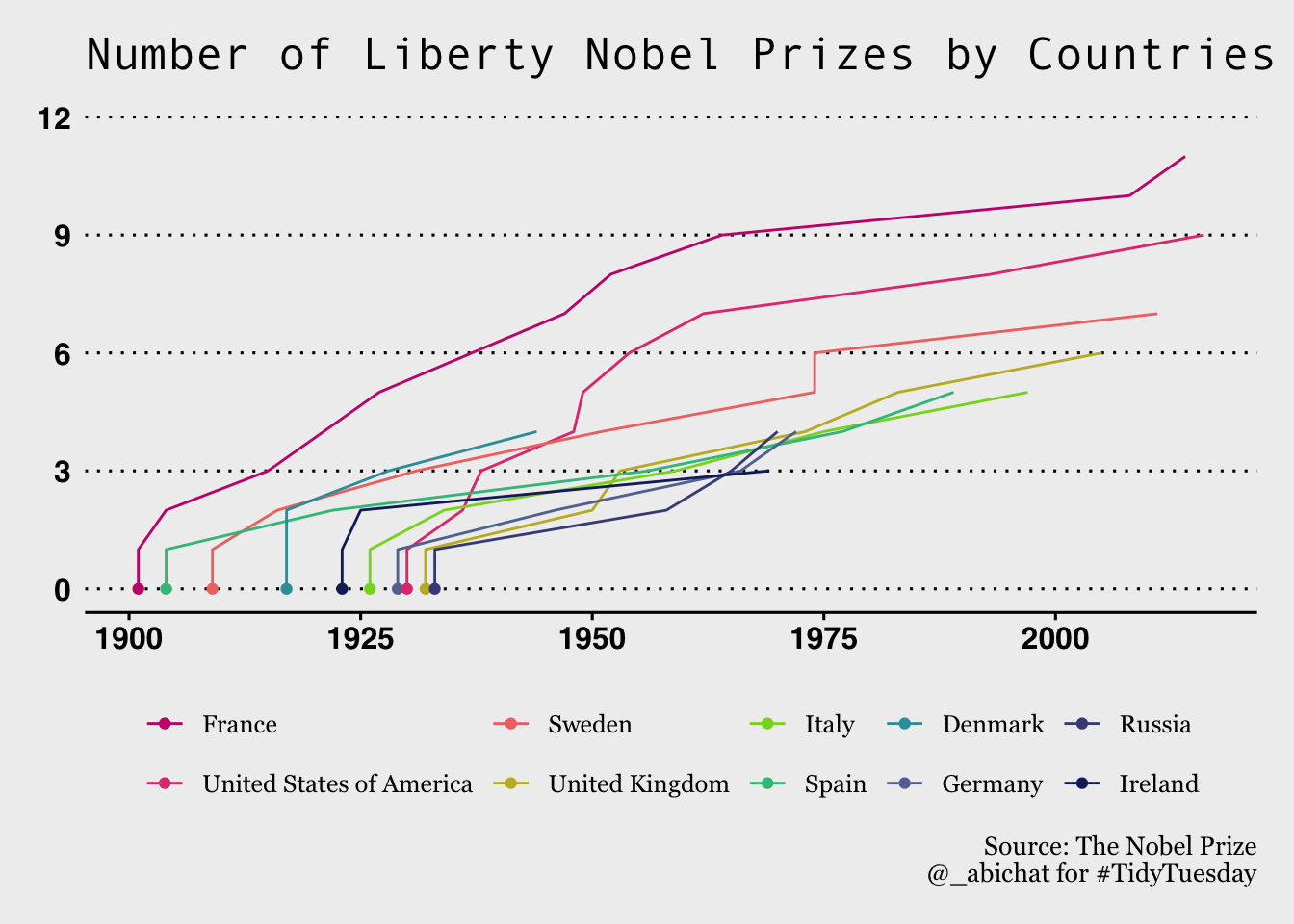 ggplotpackage to visualize some fun data. In this post, I tried to play with a Nobel Prizes Data including countries, prize year, each prize. The goal is to plot a cumulative traceplot of Liberty Nobel Prizes for top 10 countries.