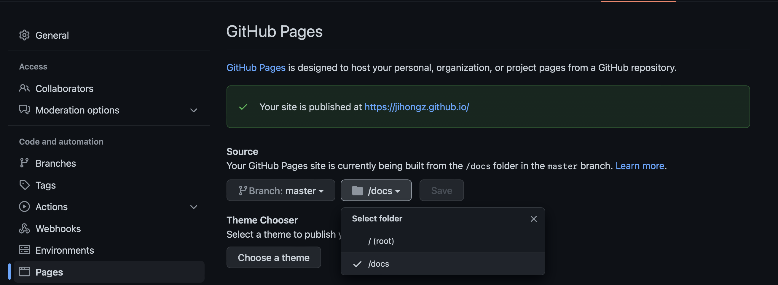 To create a website with the URL <username.github.io>, create the directory name with same name and same Github repo name. For example, my github repo name is “jihongz.github.io”, and it is published in http://jihongz.github.io.