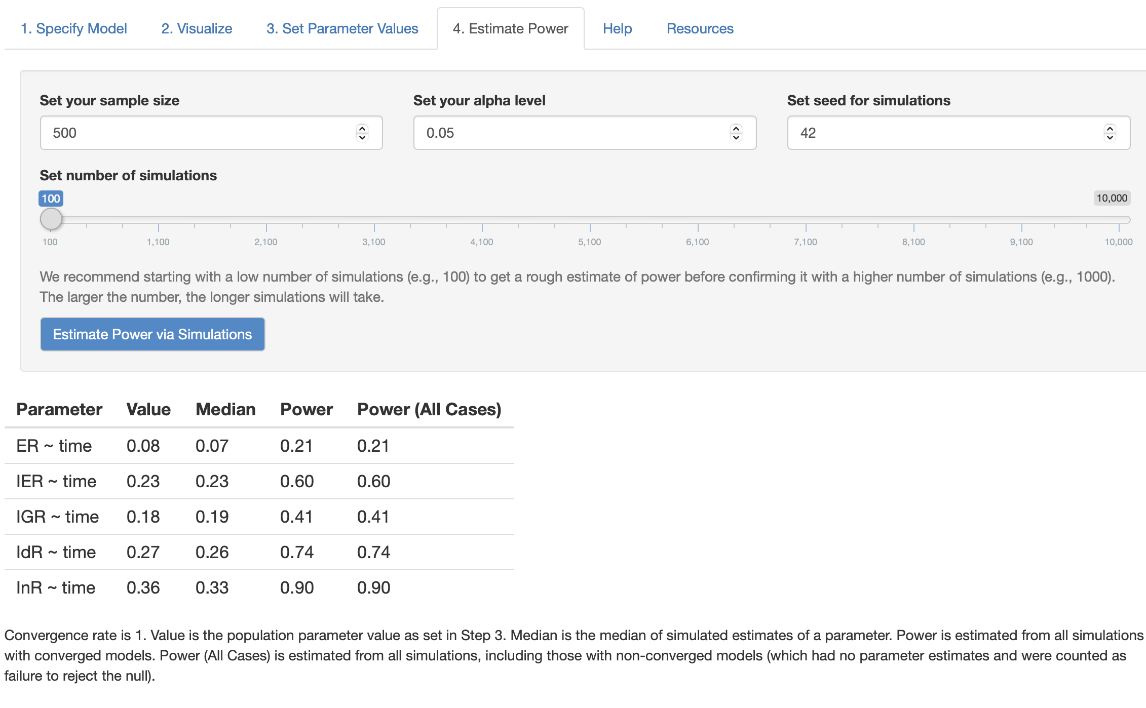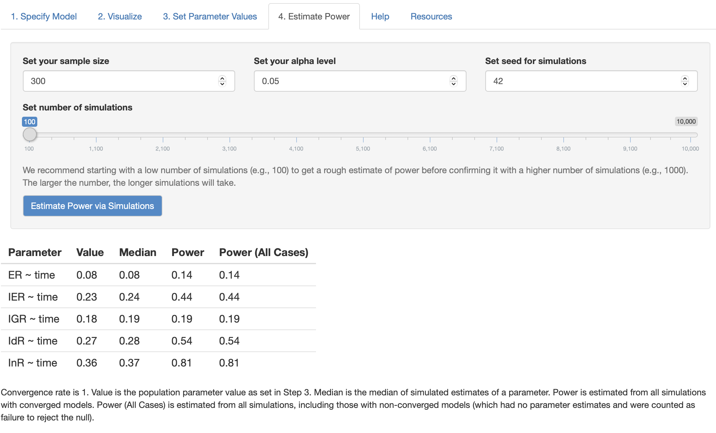 As the figures shown, based on MCMC simulation, sample size N = 300 is expected to increase the power of time effect on InR (InR ~~ time) to value 0.81 while N = 500 will increase the power to value 0.9, which is enough power for single regression coefficient effect. However, with such moderately large sample size, other time effects on ER, IRT, IGR, IdR (i.e., ER ~~ time) still stay at a low level because of the lower estimated effect size.