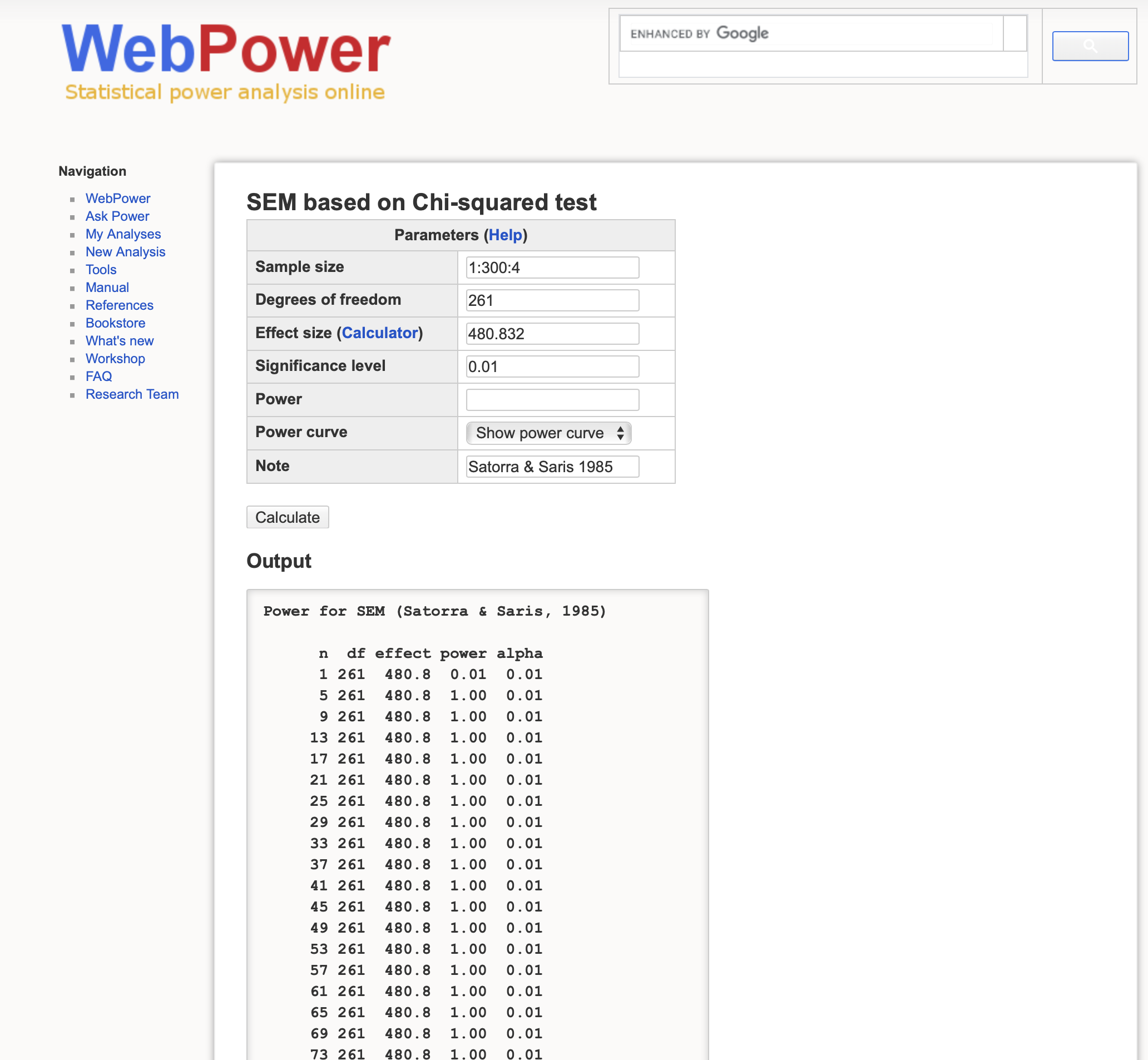 The statistical power of a hypothesis test is the probability of detecting an effect, if there’s a true effect presented to detect. Power, defined as the confidence in the conclusions drawn from the results, plays an important role of determining the minimum sample size (number of observation) required to detect an effect in an experiment. The power analysis of SEM is often ignored in application research partly because few guidelines exist for researchers to conduct power analysis in SEM framework. This tutorial introduces two web tools which can be used to conduct power analysis for Structural Equation Modeling (SEM). An empirical example of my own research on students’ time effect on academic motivations will also be presented for illustration. For privacy, only short name of the latent constructs are used.