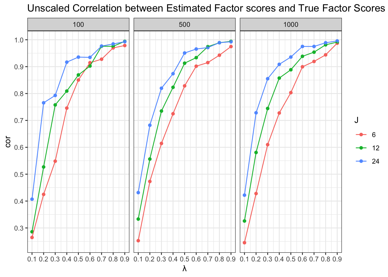 title = "Unscaled Correlation between Estimated Factor scores and True Factor Scores") +