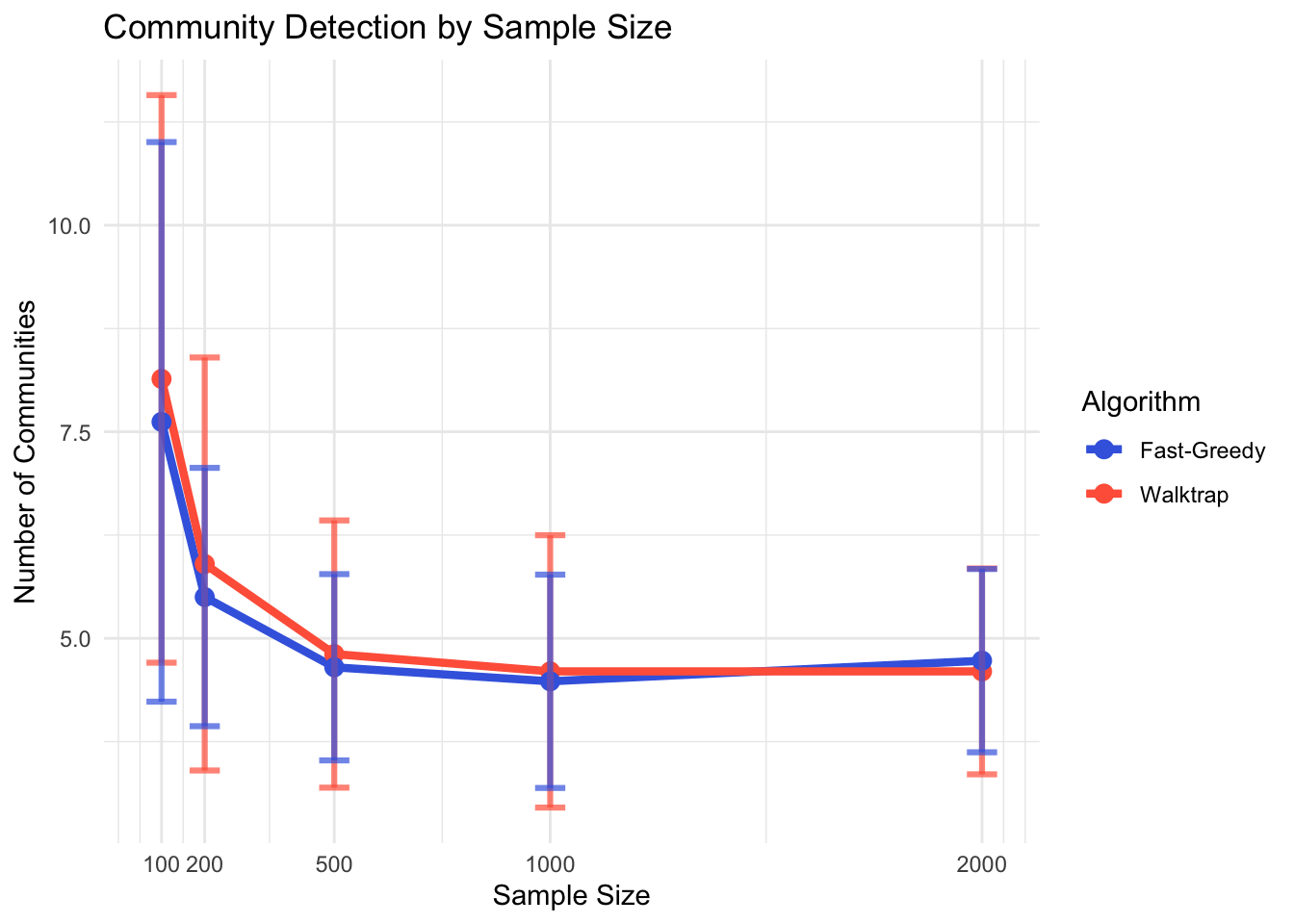 We can further examine the effect of sample size on the community detection. The sample sizes are 100, 200, 500, 1000, and 2000. The bootstrapping resampling method with 100 replications is used for variability in each condition.