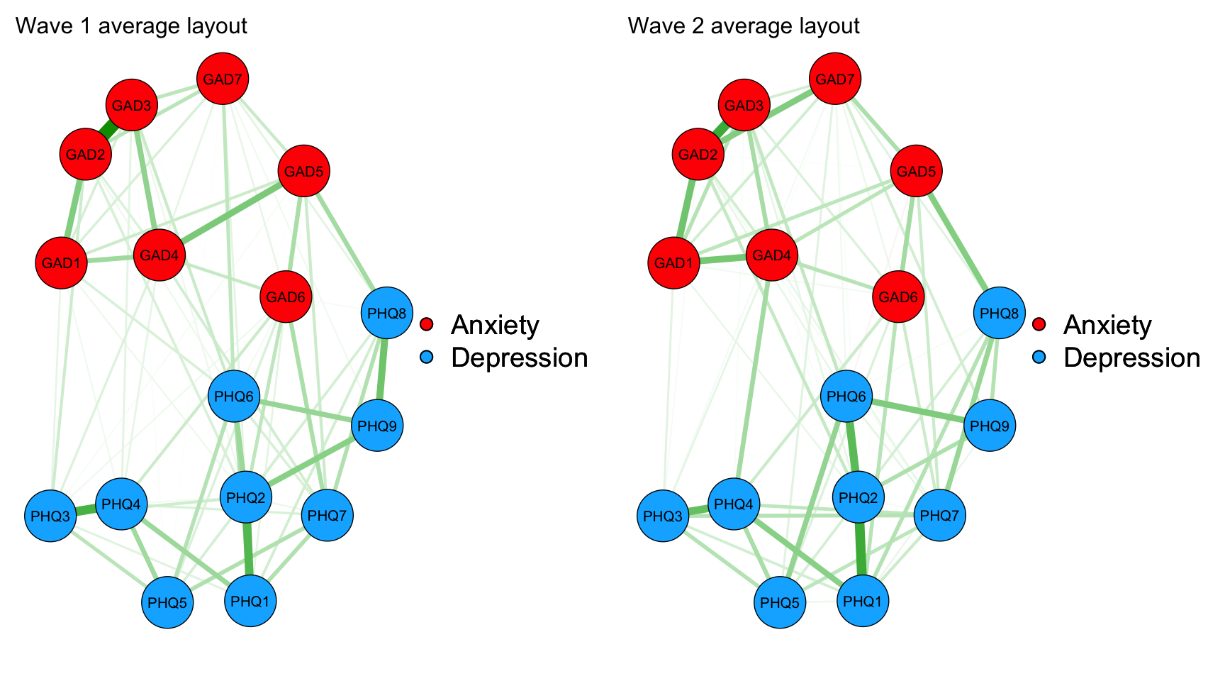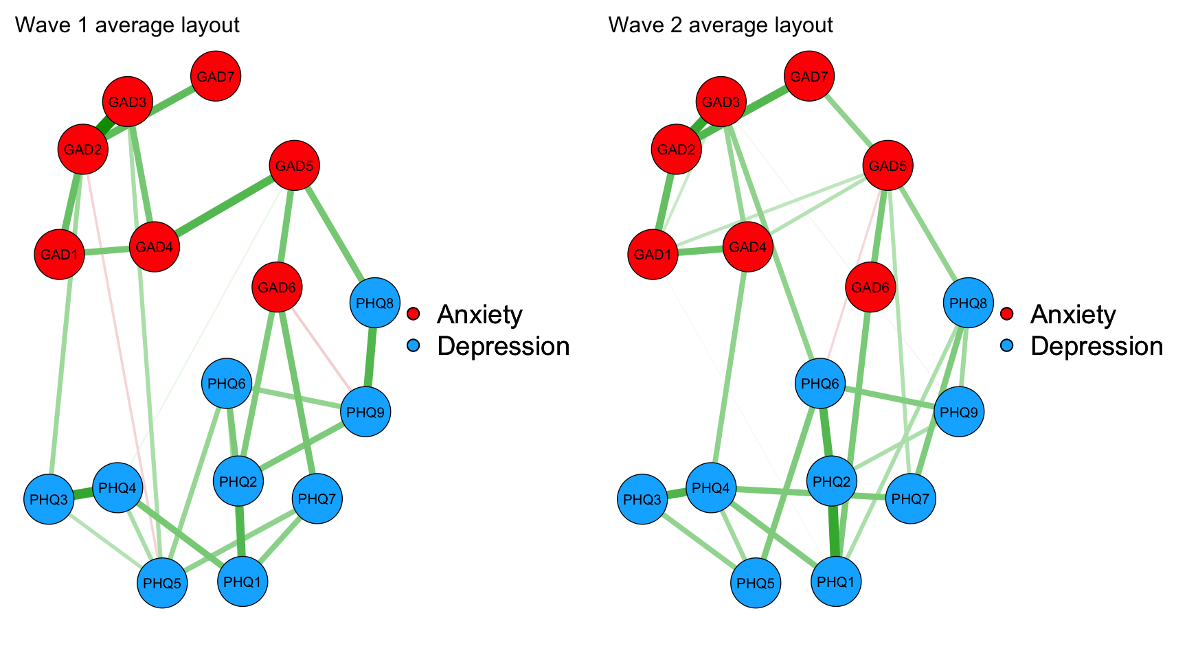 Model 1 — The depression and anxiety symptom networks were estimated as Gaussian graphical models (GGM) separately at each wave using graphical LASSO regularization with EBIC.