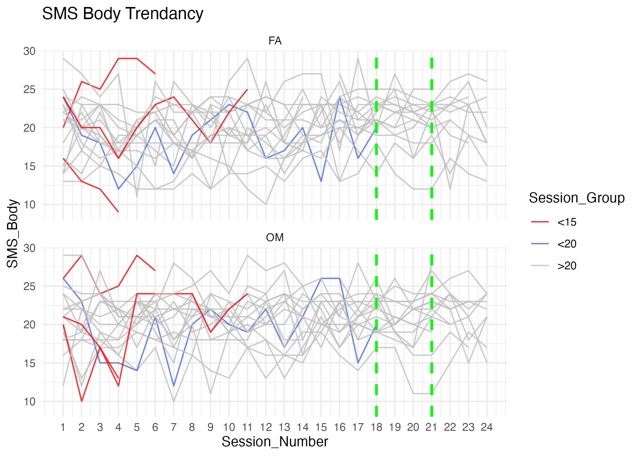 Sample: 19 participants completed 8 weeks of FA training with 3 visits per week, resulting in 24 sessions.