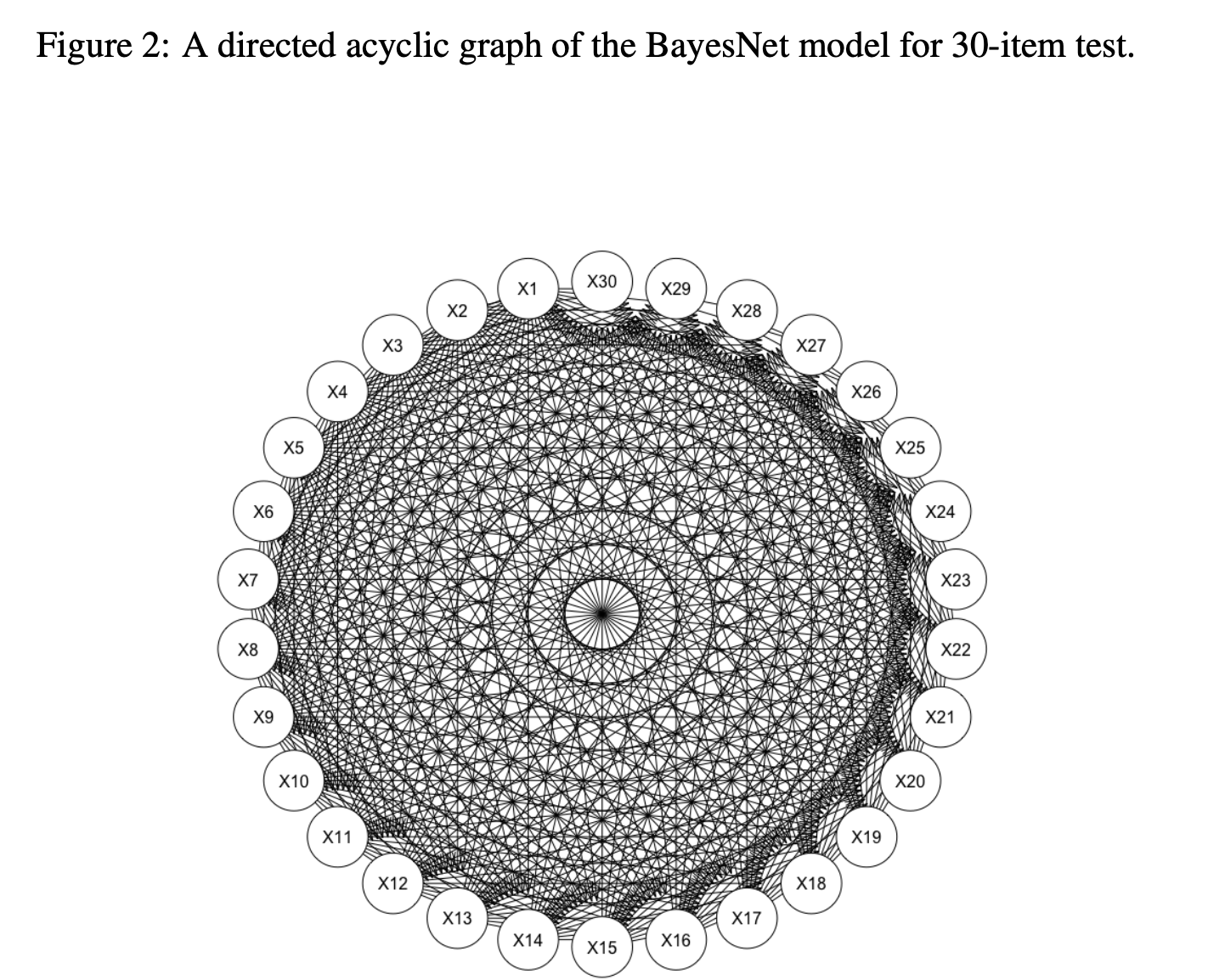 I created a BayesNet model for 30 survey items. It simulates the complete item relationships, which can still be estimated using Bayesian analysis.