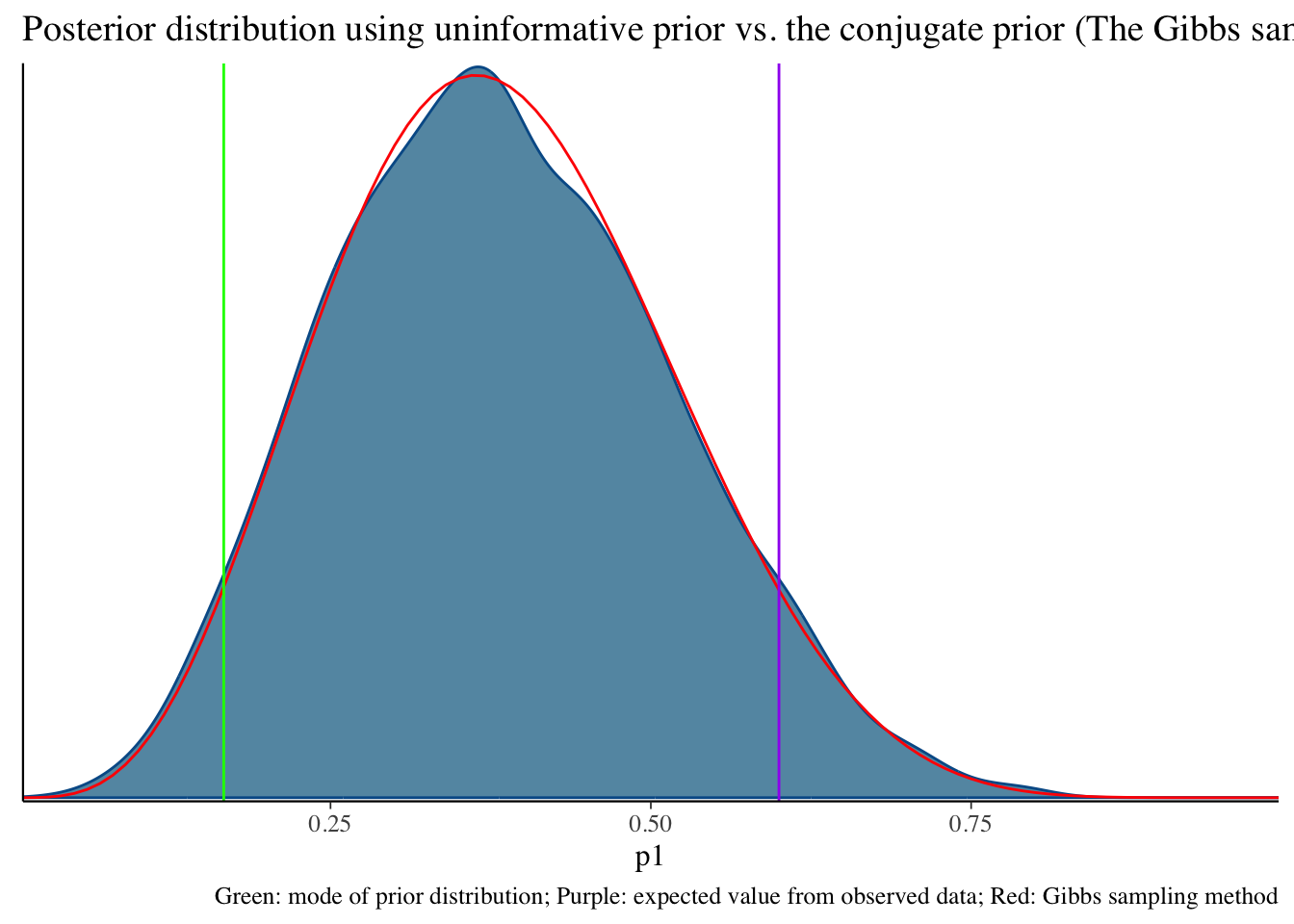 labs(title = "Posterior distribution using uninformative prior vs. the conjugate prior (The Gibbs sampler) method", caption = 'Green: mode of prior distribution; Purple: expected value from observed data; Red: Gibbs sampling method')Click here to see R code