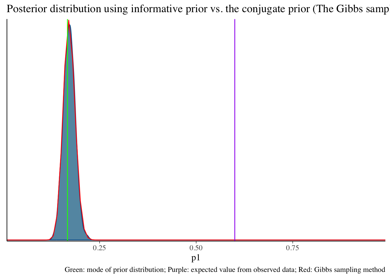 labs(title = "Posterior distribution using informative prior vs. the conjugate prior (The Gibbs sampler) method", caption = 'Green: mode of prior distribution; Purple: expected value from observed data; Red: Gibbs sampling method')Click here to see R code