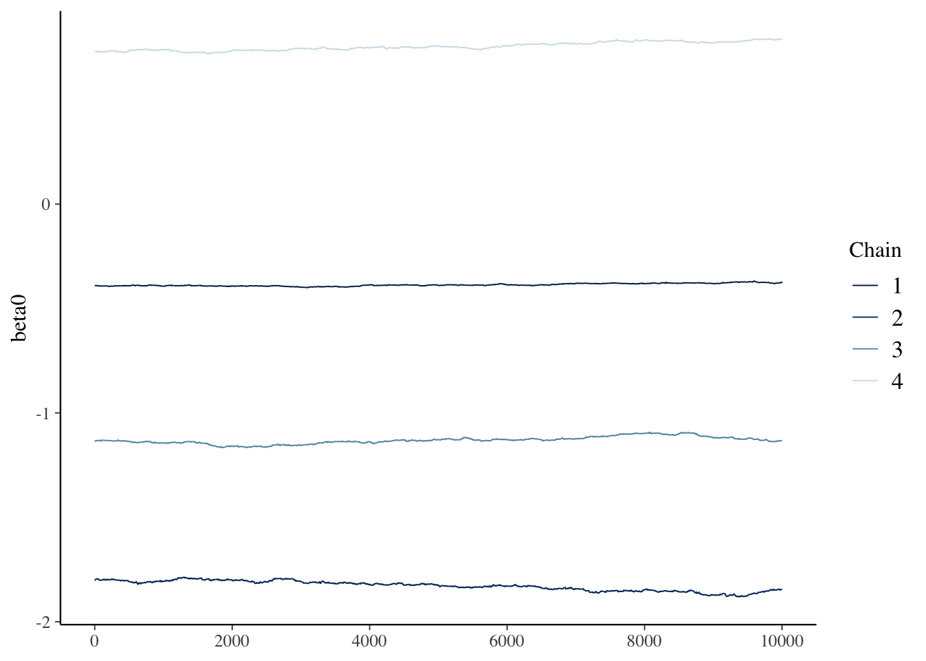 - Two most common: visual inspection and Gelman-Rubin Potential Scale Reduction Factor (PSRF)