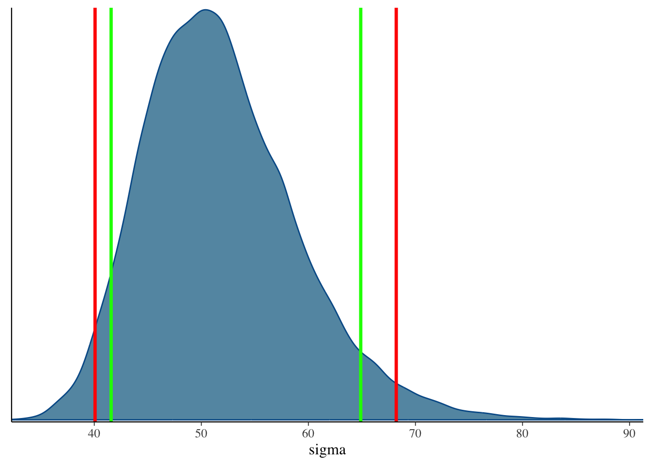 geom_vline(xintercept = quantile(model00.samples$draws('sigma'), c(.05, .95)), col = "green", size = 1.2)