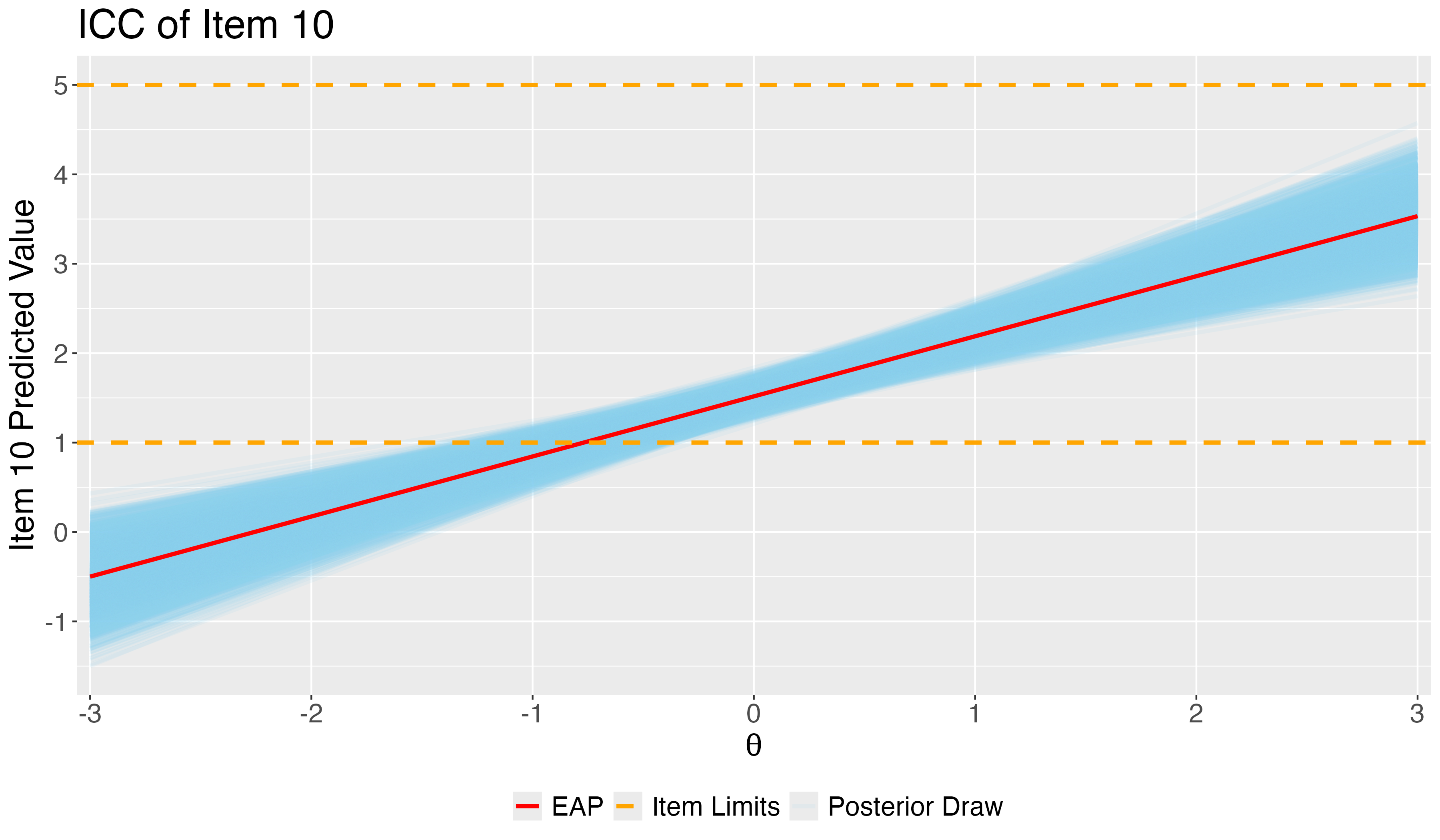 Because we have sampled values for each parameter, we can plot one ICC for each posterior draw