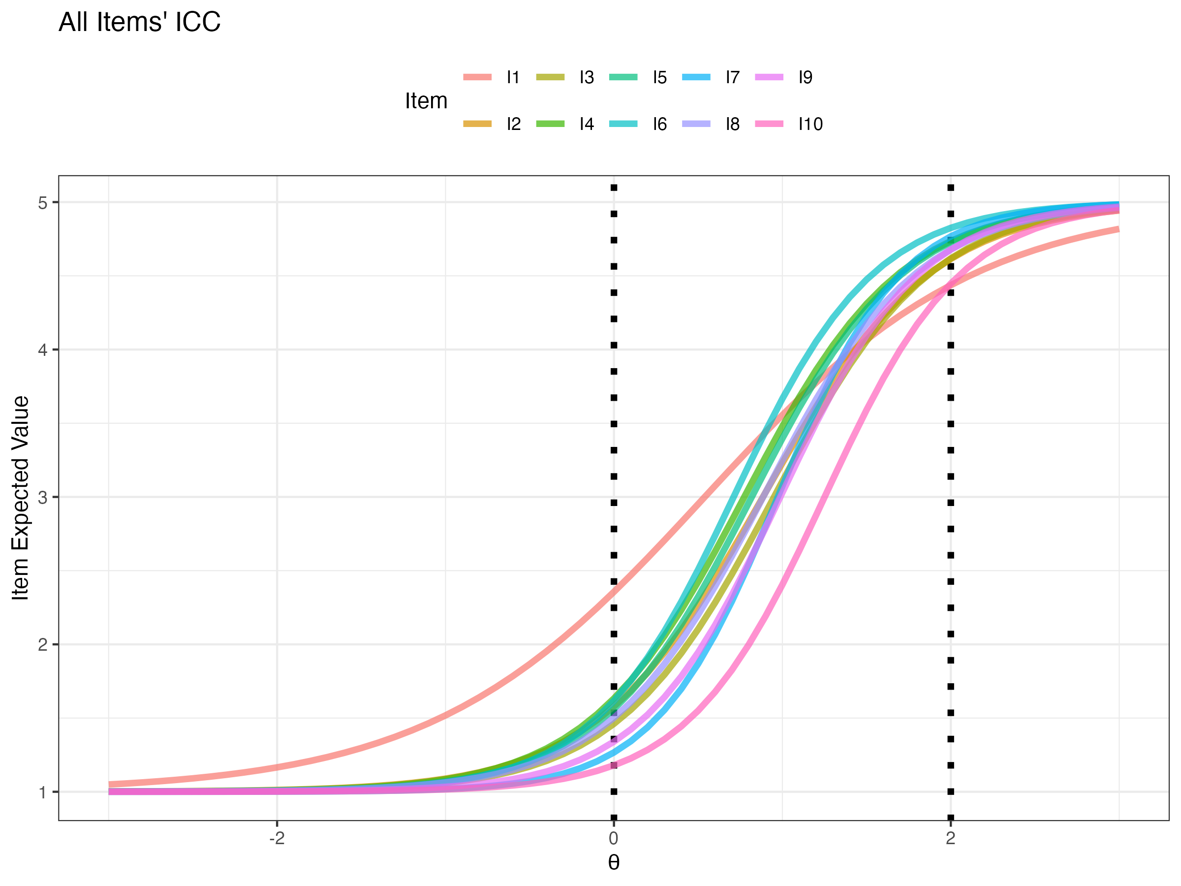 - Shown in slope/intercept form (but could be distrimination/difficulty for unidimensional items)