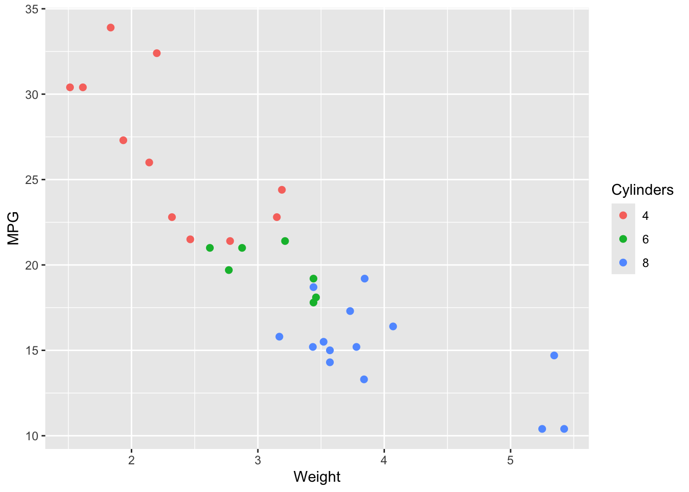 labs(color = "Cylinders", x = "Weight", y = "MPG")