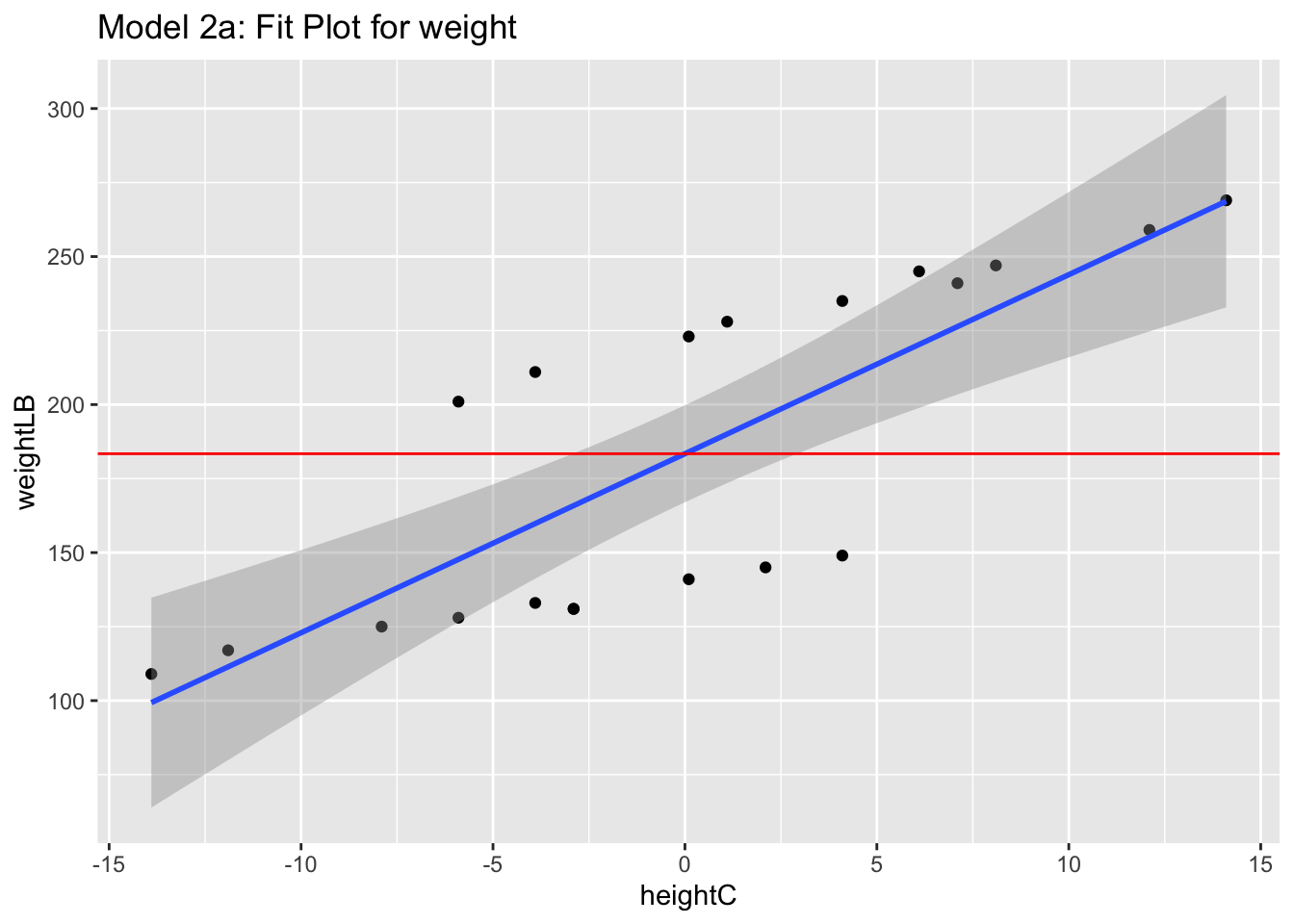 summary(model5)Call: lm(formula = weightLB ~ heightC * female, data = dataSexHeightWeight) Residuals: Min 1Q Median 3Q Max -3.8312 -1.7797 0.4958 1.3575 3.3585 Coefficients: Estimate Std. Error t value Pr(>|t|) (Intercept) 222.1842 0.8381 265.11 < 2e-16 *** heightC 3.1897 0.1114 28.65 3.55e-15 *** femaleTRUE -82.2719 1.2111 -67.93 < 2e-16 *** heightC:femaleTRUE -1.0939 0.1678 -6.52 7.07e-06 *** --- Signif. codes: 0 '***' 0.001 '**' 0.01 '*' 0.05 '.' 0.1 ' ' 1 Residual standard error: 2.175 on 16 degrees of freedom Multiple R-squared: 0.9987, Adjusted R-squared: 0.9985 F-statistic: 4250 on 3 and 16 DF, p-value: < 2.2e-16