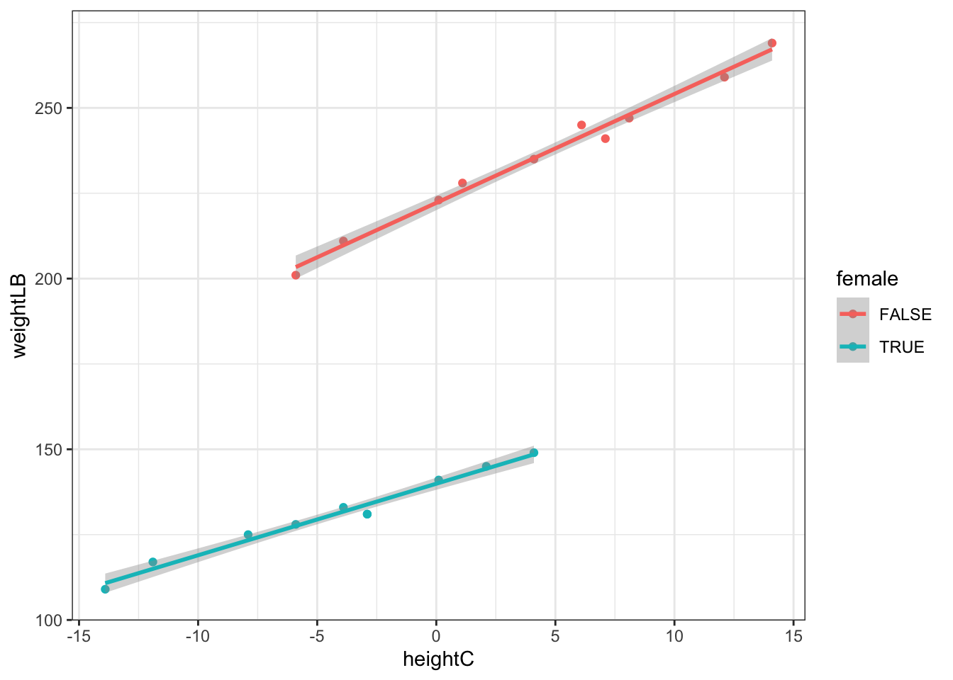 \text{Weight}_p = \beta_0 + \beta_1 \text{HeightC}_p + \beta_2 \text{Female}_p +\beta_3 \text{HeightCxFemale}_p+ e_p