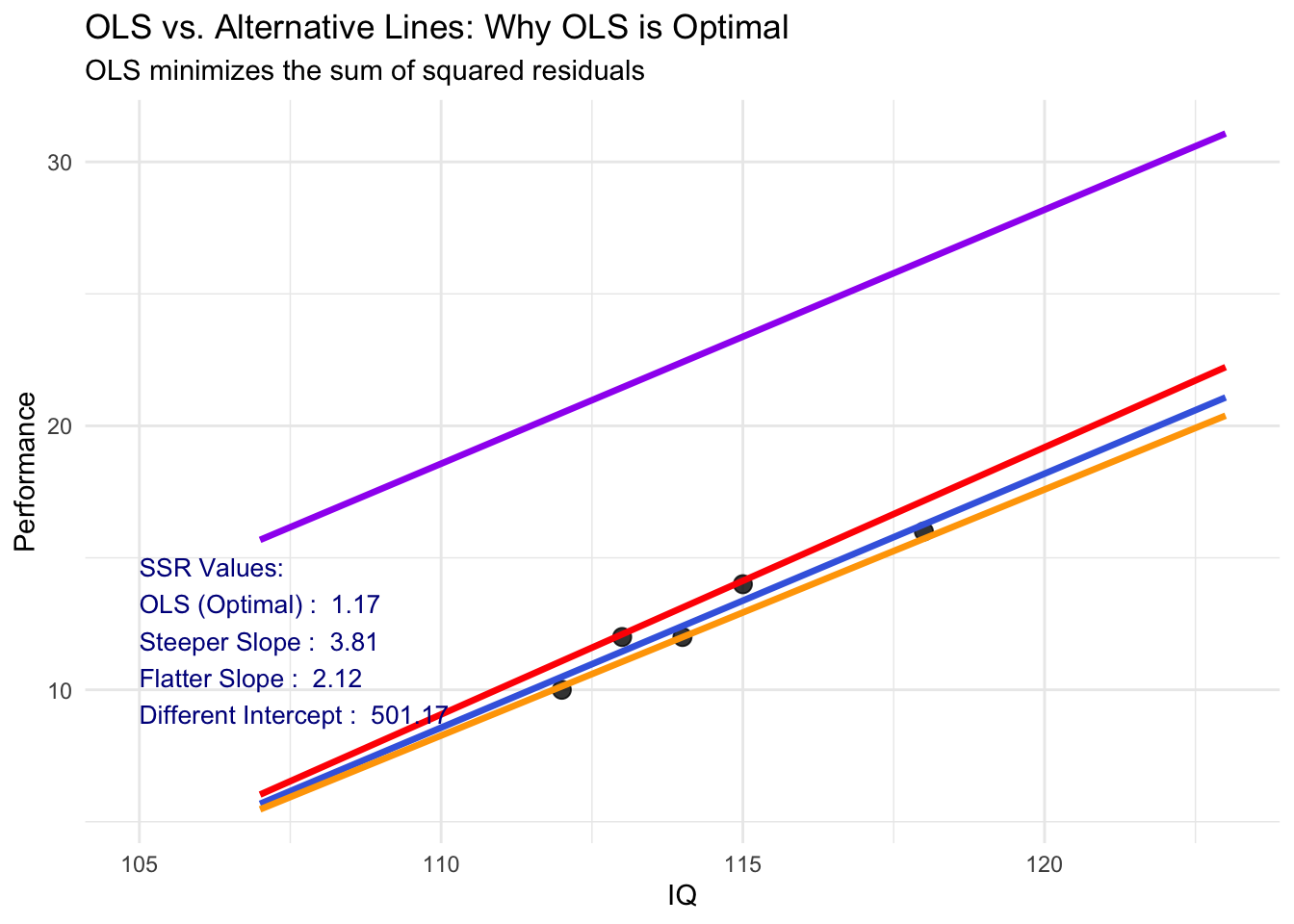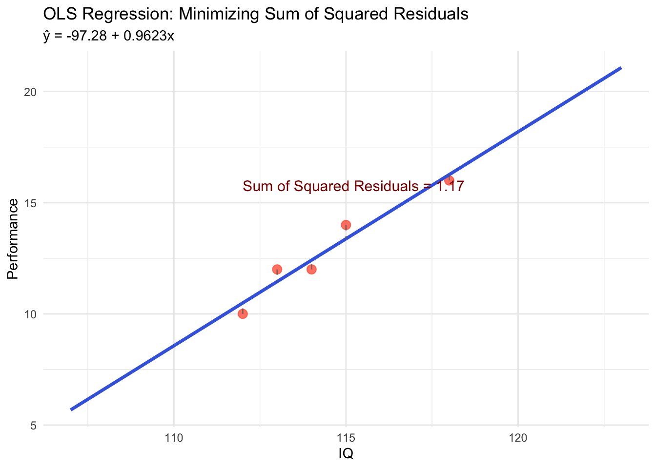 Key Idea: Among all possible lines, OLS chooses the one that makes the total squared distance between observed values and predicted values as small as possible
