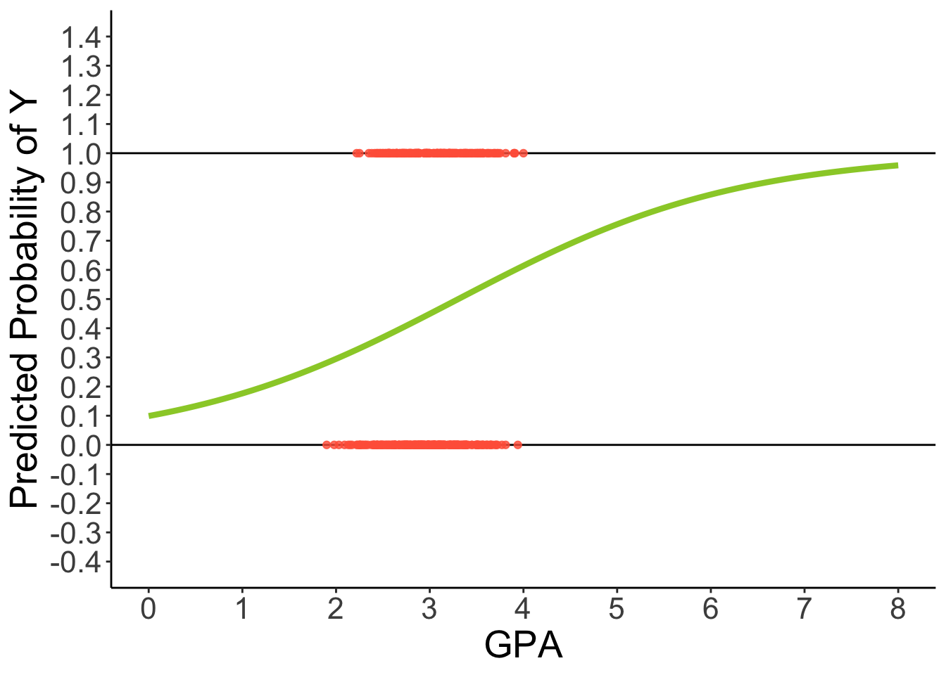- For every one-unit increase in GPA, the logit of applying for grad school increases by 0.5482. This corresponds to the odds of applying being multiplied by a factor of \exp(0.5482) = 1.73.