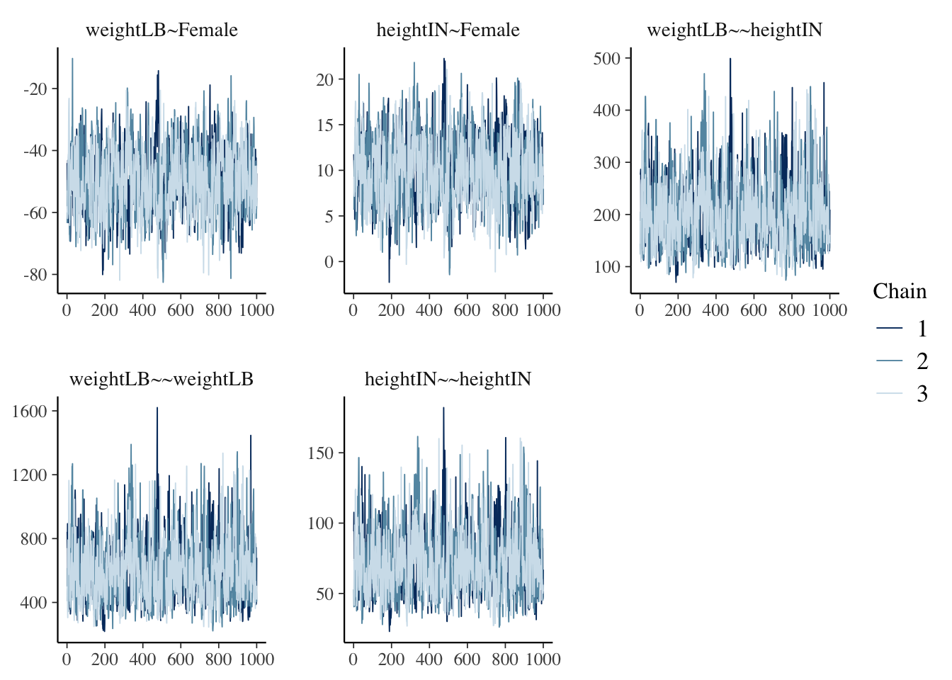 model01.fit_ML = sem(model01.syntax, data=dat)Trace Plots of Parameters