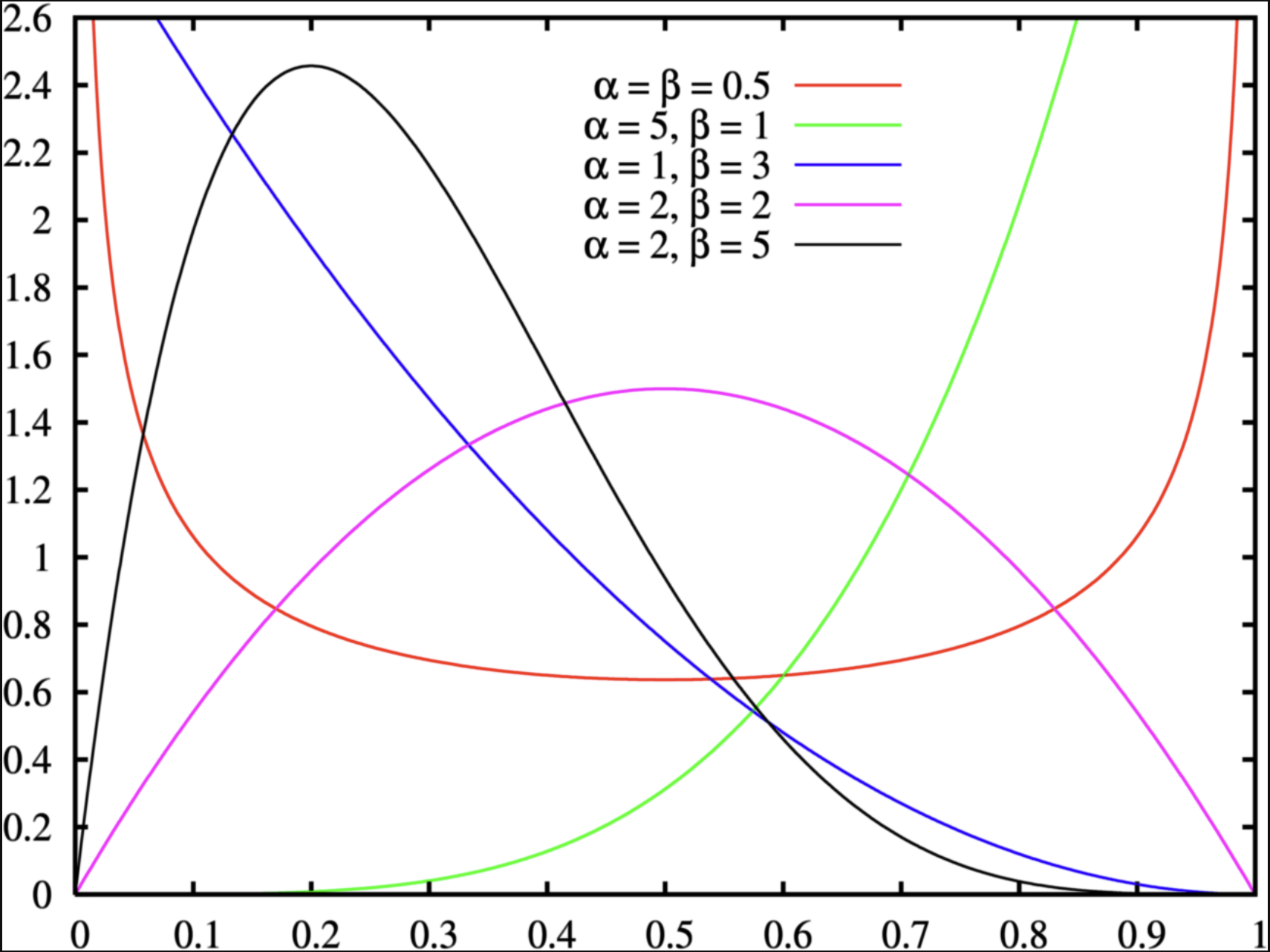 The Beta distribution has a mean of \frac{\alpha}{\alpha+\beta} and a mode of \frac{\alpha -1}{\alpha + \beta -2} for \alpha > 1 & \beta > 1; (fun fact: when \alpha\ \&\ \beta< 1, pdf is U-shape, what that mean?)