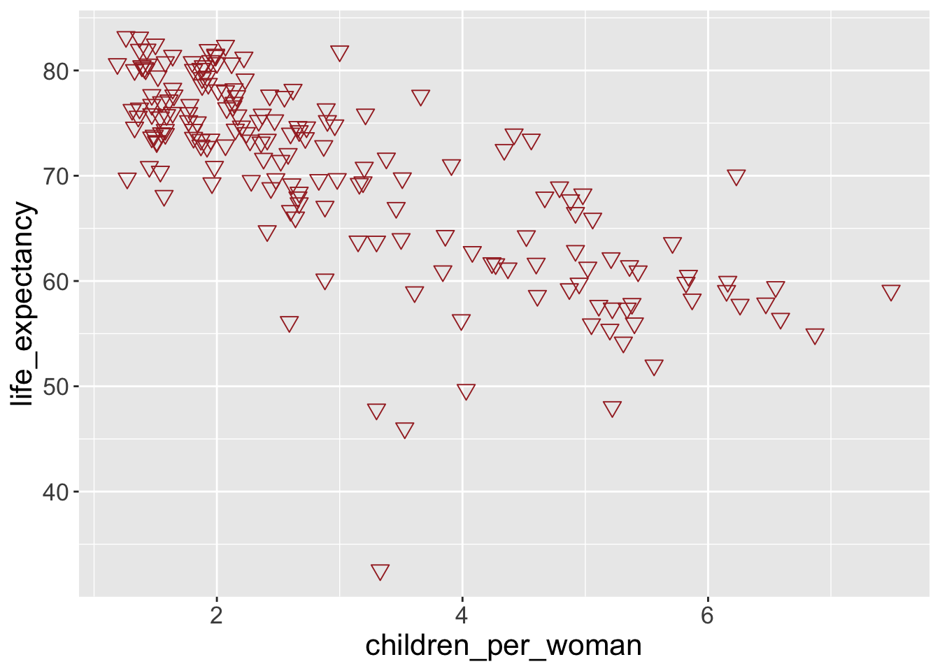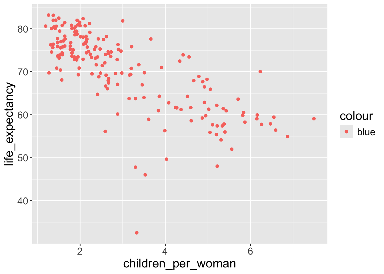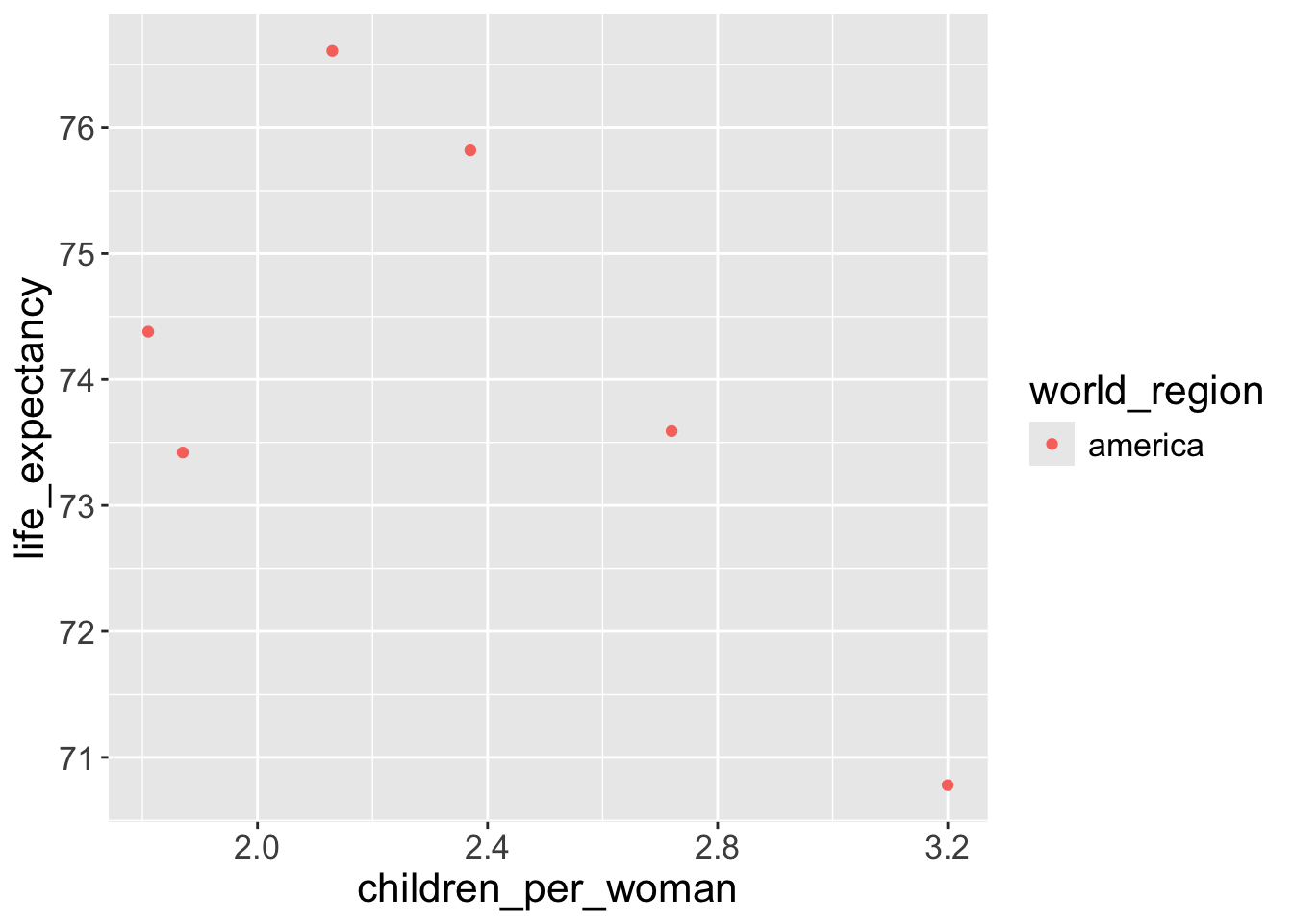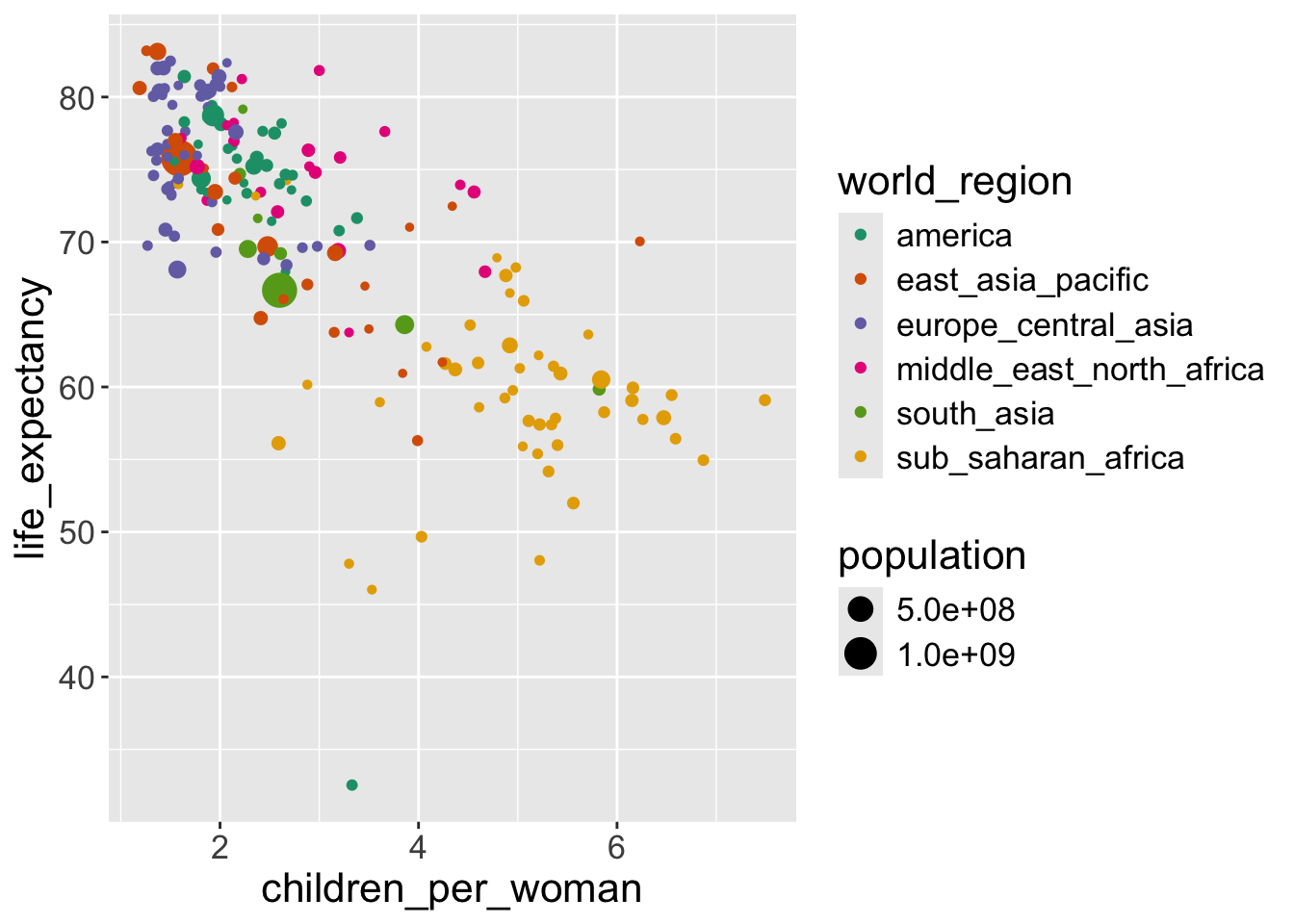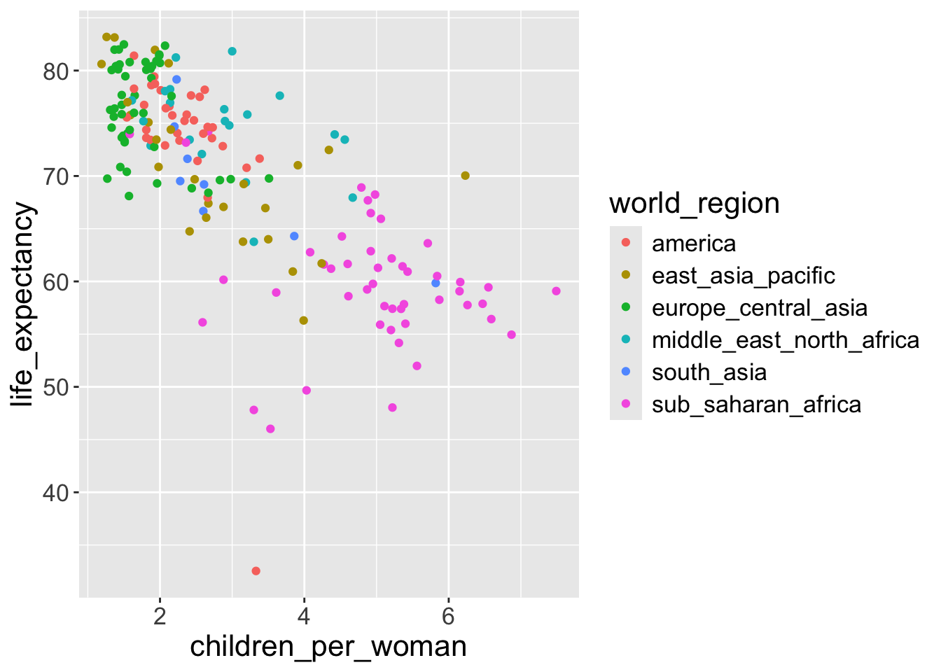 aes(x = children_per_woman, y = life_expectancy, color = world_region)) +