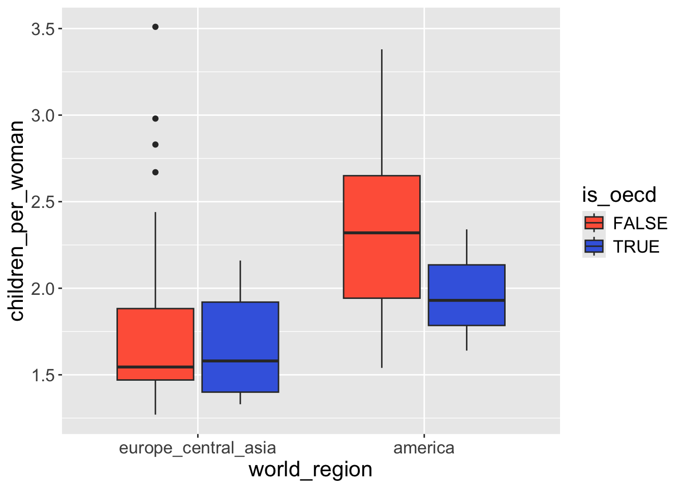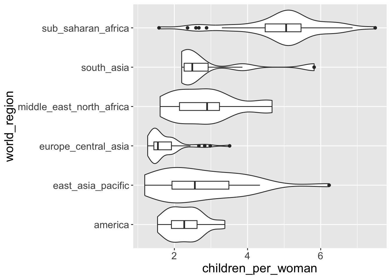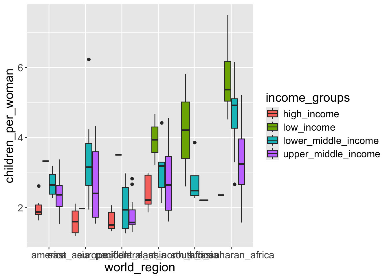 geom_boxplot(aes(fill = world_region), width = 0.2)Although this graph looks appealing, the color is redundant with the x-axis labels. So, the same information is being shown with multiple aesthetics. This is not necessarily incorrect, but we should generally avoid too much gratuitous use of color in graphs. At the very least we should remove the legend from this graph.