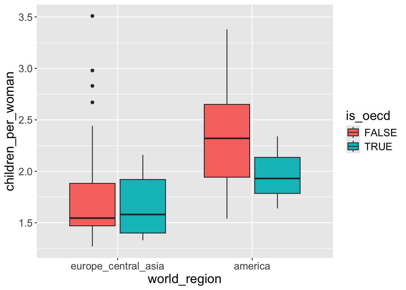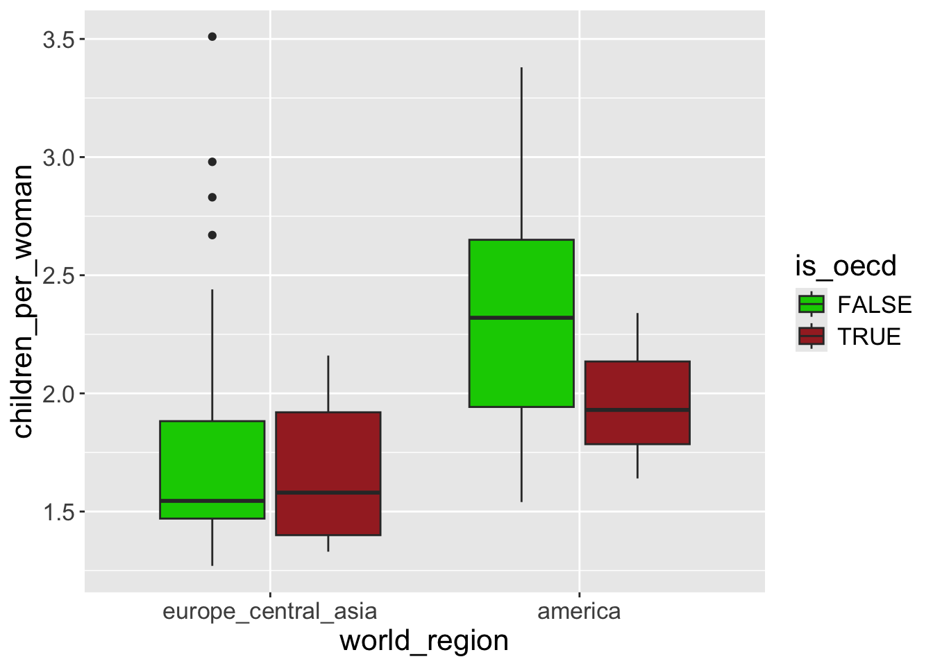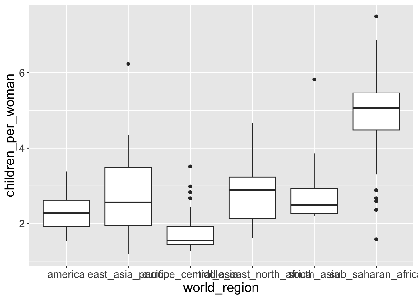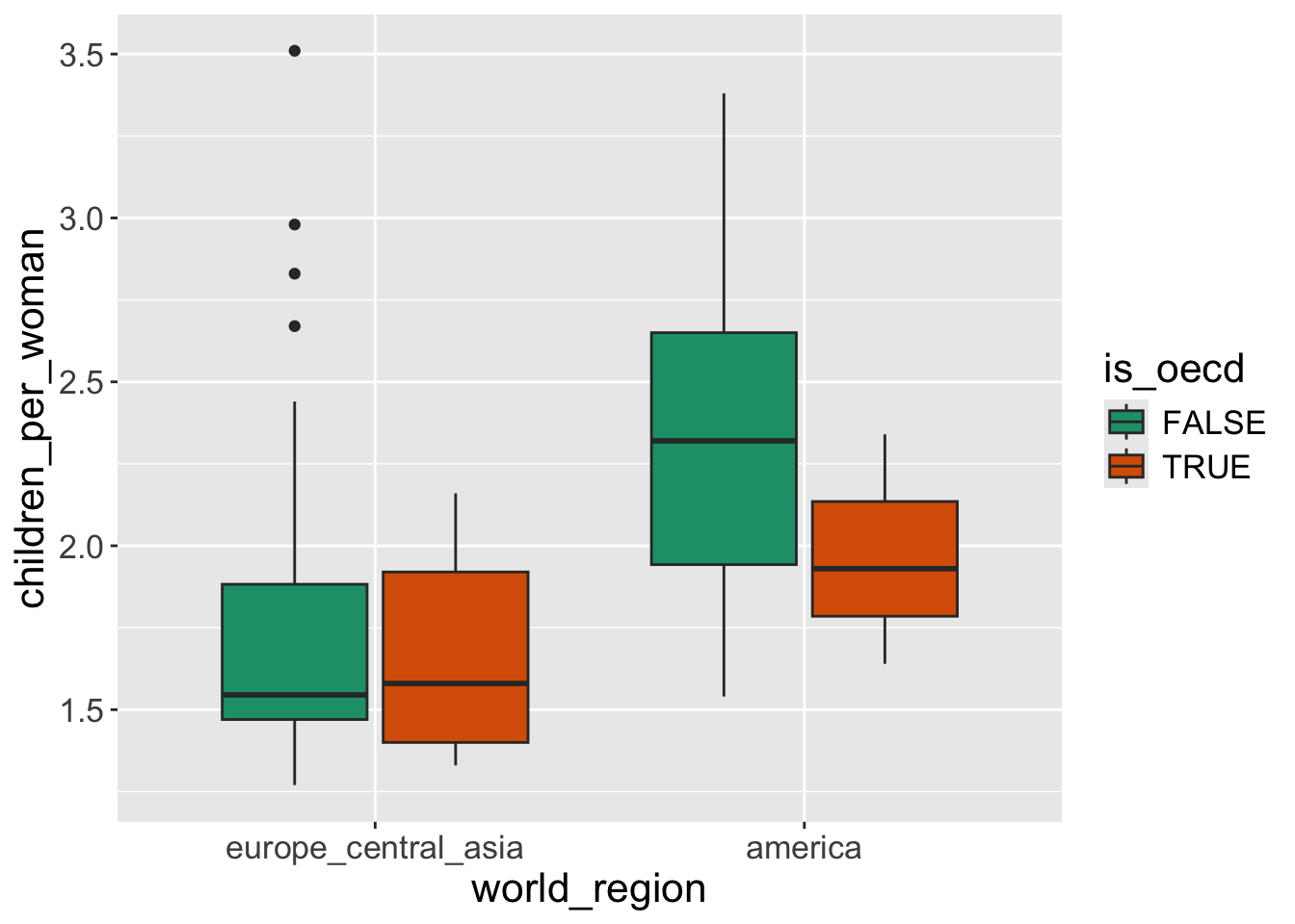 geom_boxplot(aes(fill = world_region), width = 0.2)Although this graph looks appealing, the color is redundant with the x-axis labels. So, the same information is being shown with multiple aesthetics. This is not necessarily incorrect, but we should generally avoid too much gratuitous use of color in graphs. At the very least we should remove the legend from this graph.