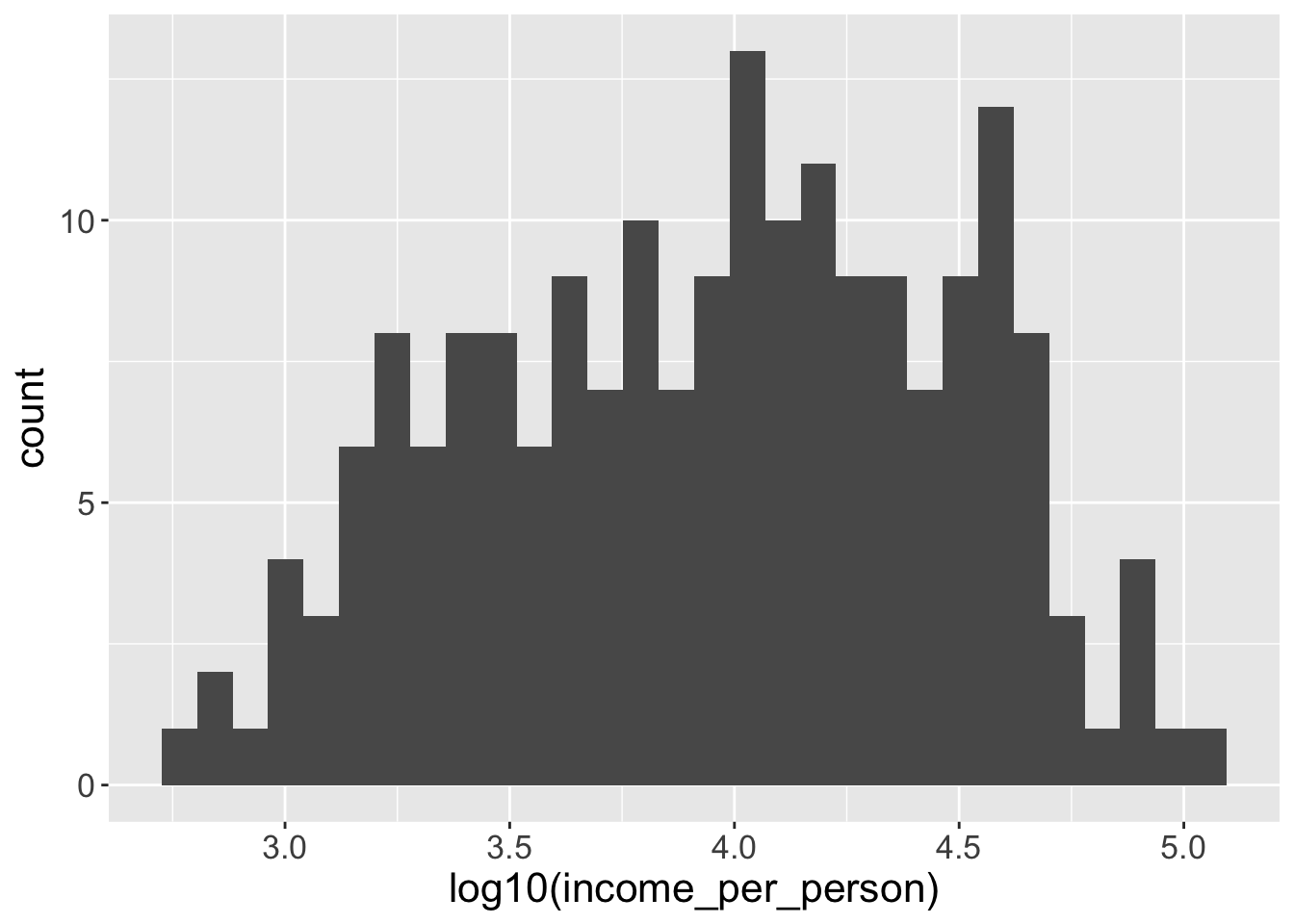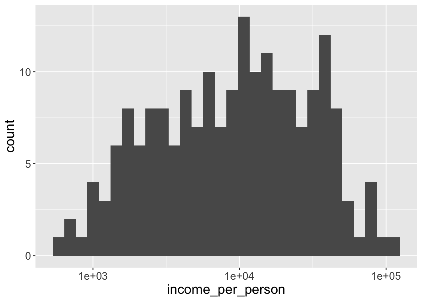 scale_y_continuous(limits = c(70, 85))You can also apply transformations to the data. For example, consider the distribution of income across countries, represented using a histogram: