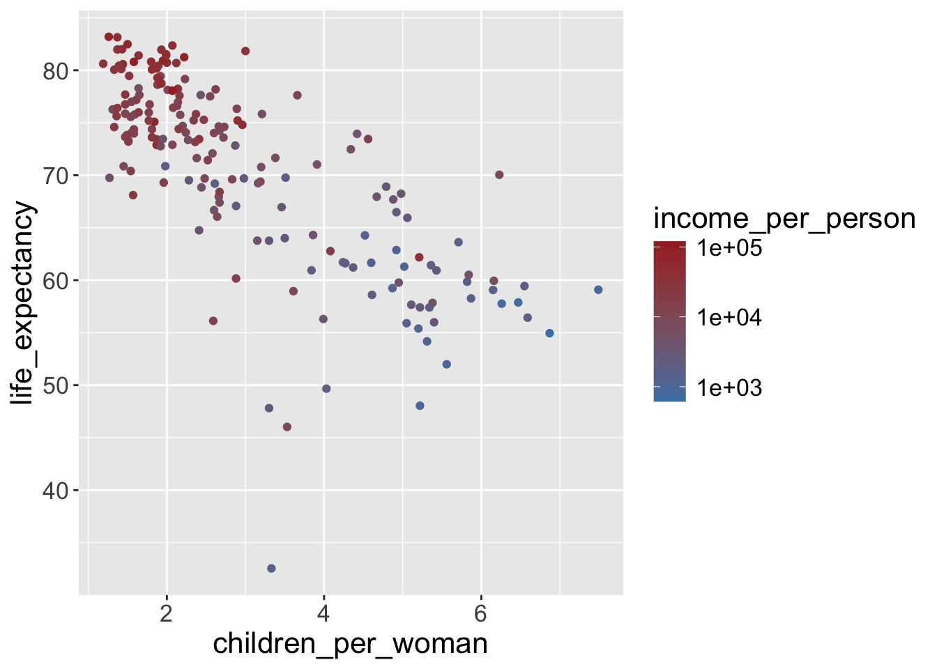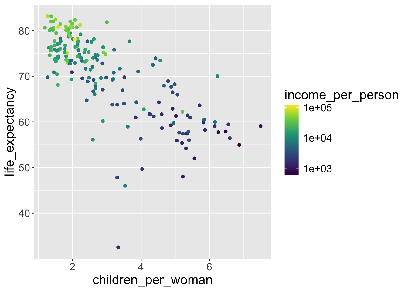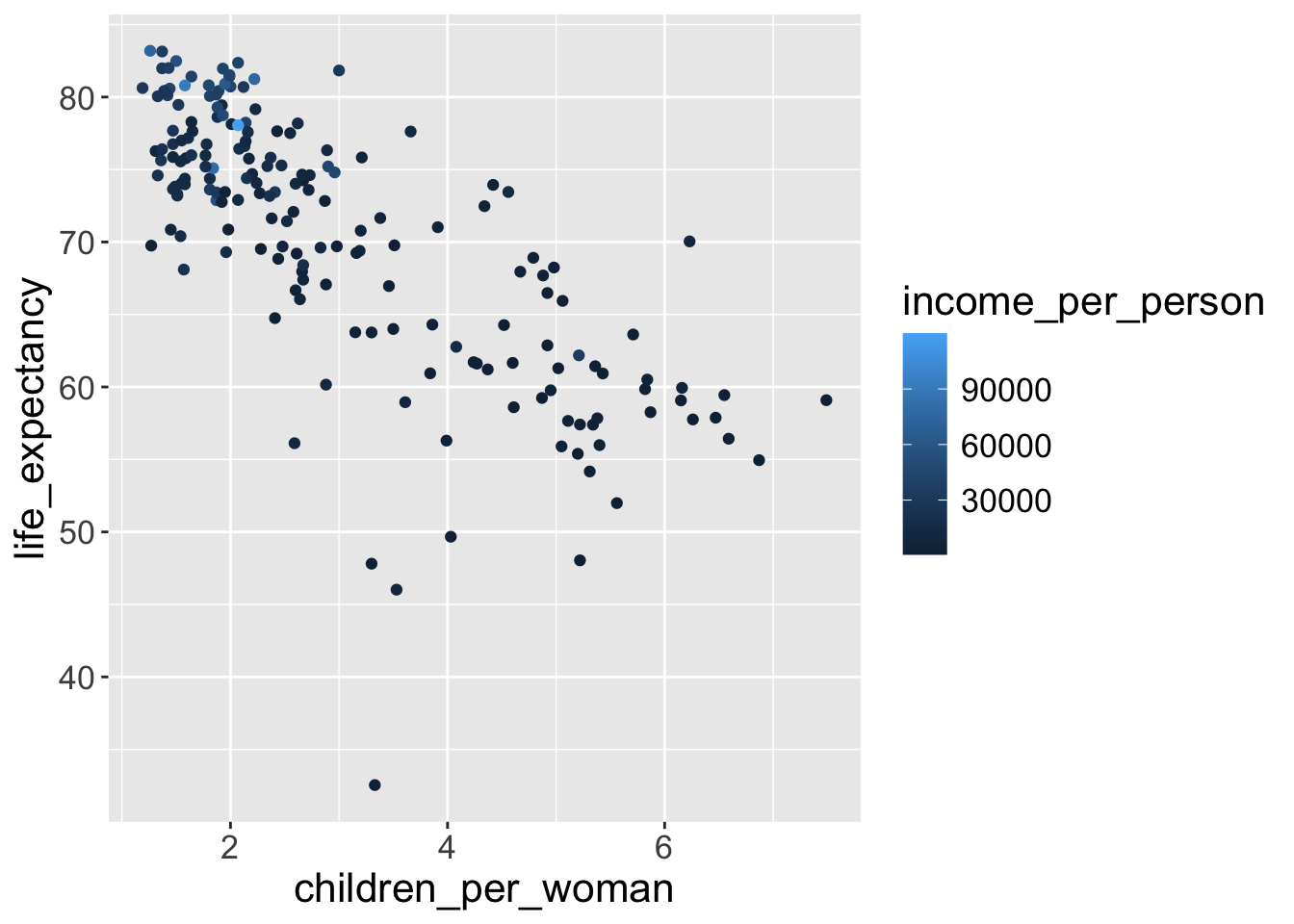 geom_point(aes(color = income_per_person))Because income_per_person is a continuous variable, ggplot created a gradient color scale.