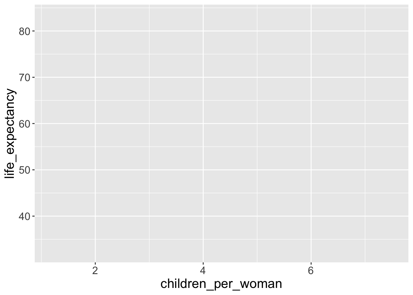 That “worked” (as in, we didn’t get an error). But because we didn’t give ggplot() any variables/columns to be mapped to aesthetic components of the graph, we just got an empty square or a blank canvas.