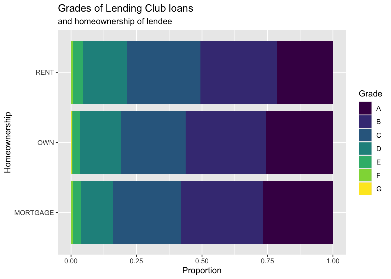 Which bar plot is a more useful representation for visualizing the relationship between homeownership and grade?