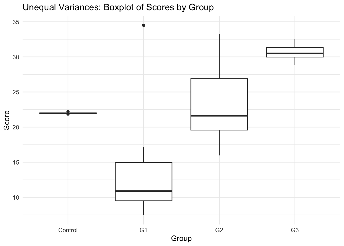 labs(title = "Equal Variance: Boxplot of Scores by Group", x = "Group", y = "Score")4.4.1.2 Unequal Variances across groups
