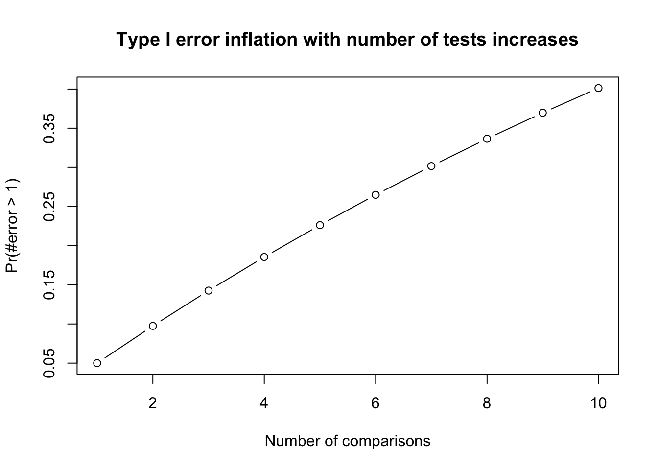- Type I error rate is inflated when we do multiple comparison (testing multiple $H_0$s given the same data)