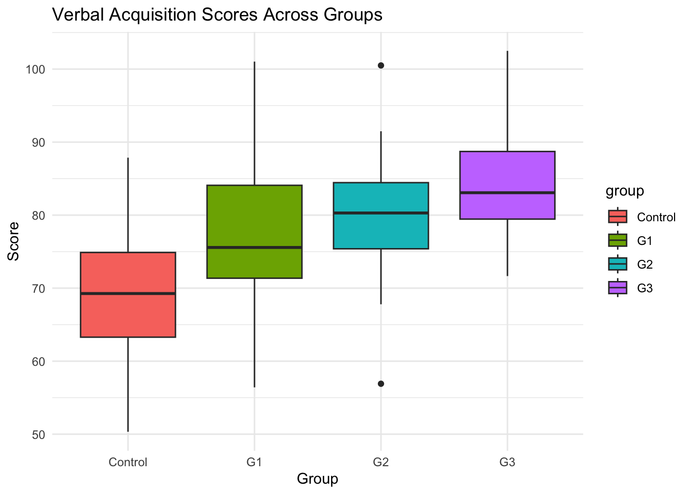 2. A one-way ANOVA was then conducted to examine the effect of three intensive intervention methods (Control, G1, G2, G3) on verbal acquisition scores. There was a statistically significant difference between groups, $F(3,116)=14.33$, $p<.001$.