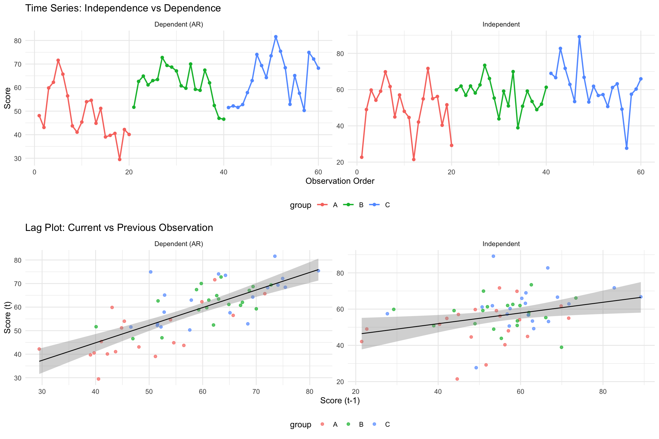 - **Solution**: Repeated Measures ANOVA, Mixed ANOVA, Multilevel Model