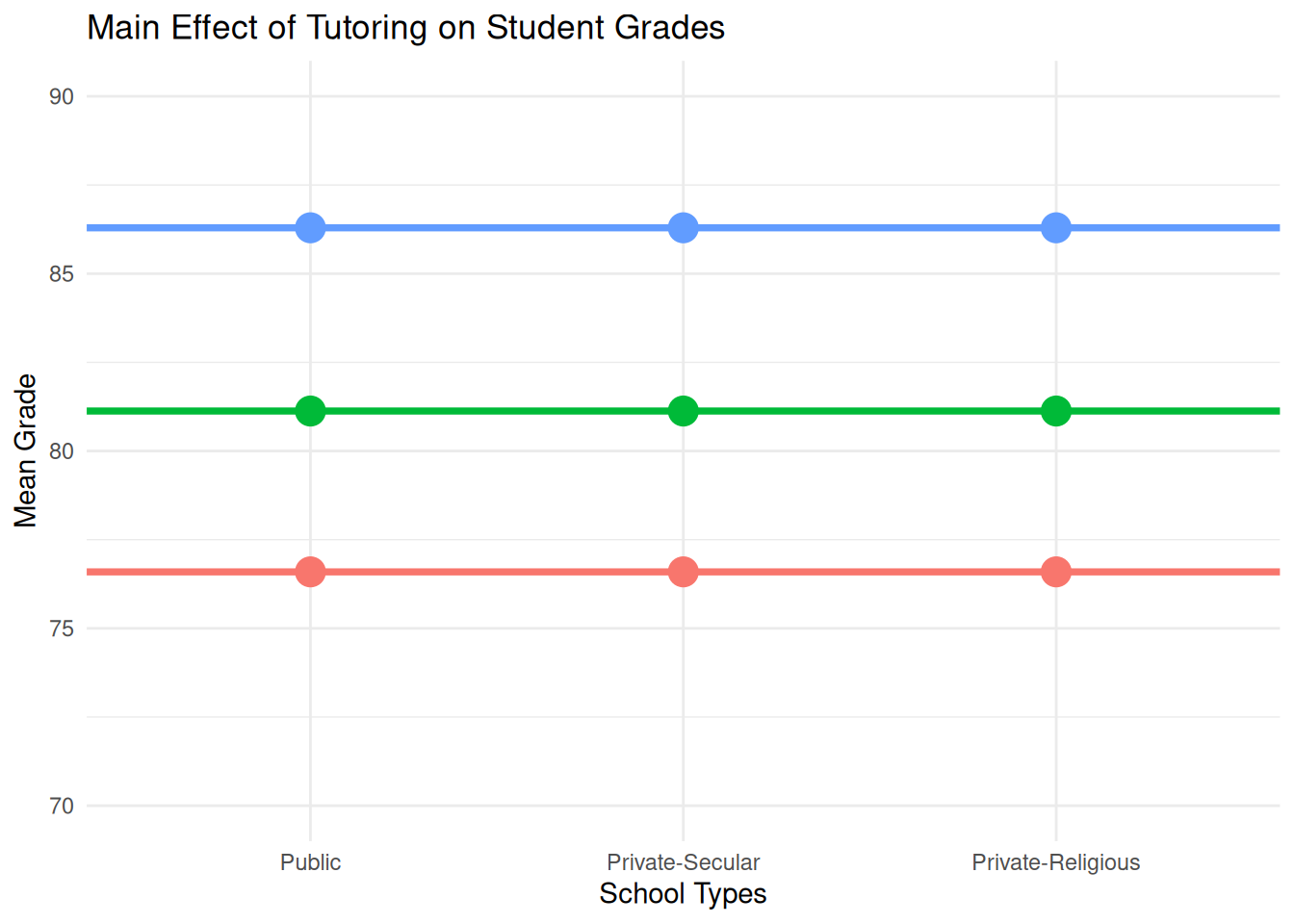- If the main effect of tutoring is significant, we expect to see noticeable differences in mean grades across tutoring conditions.