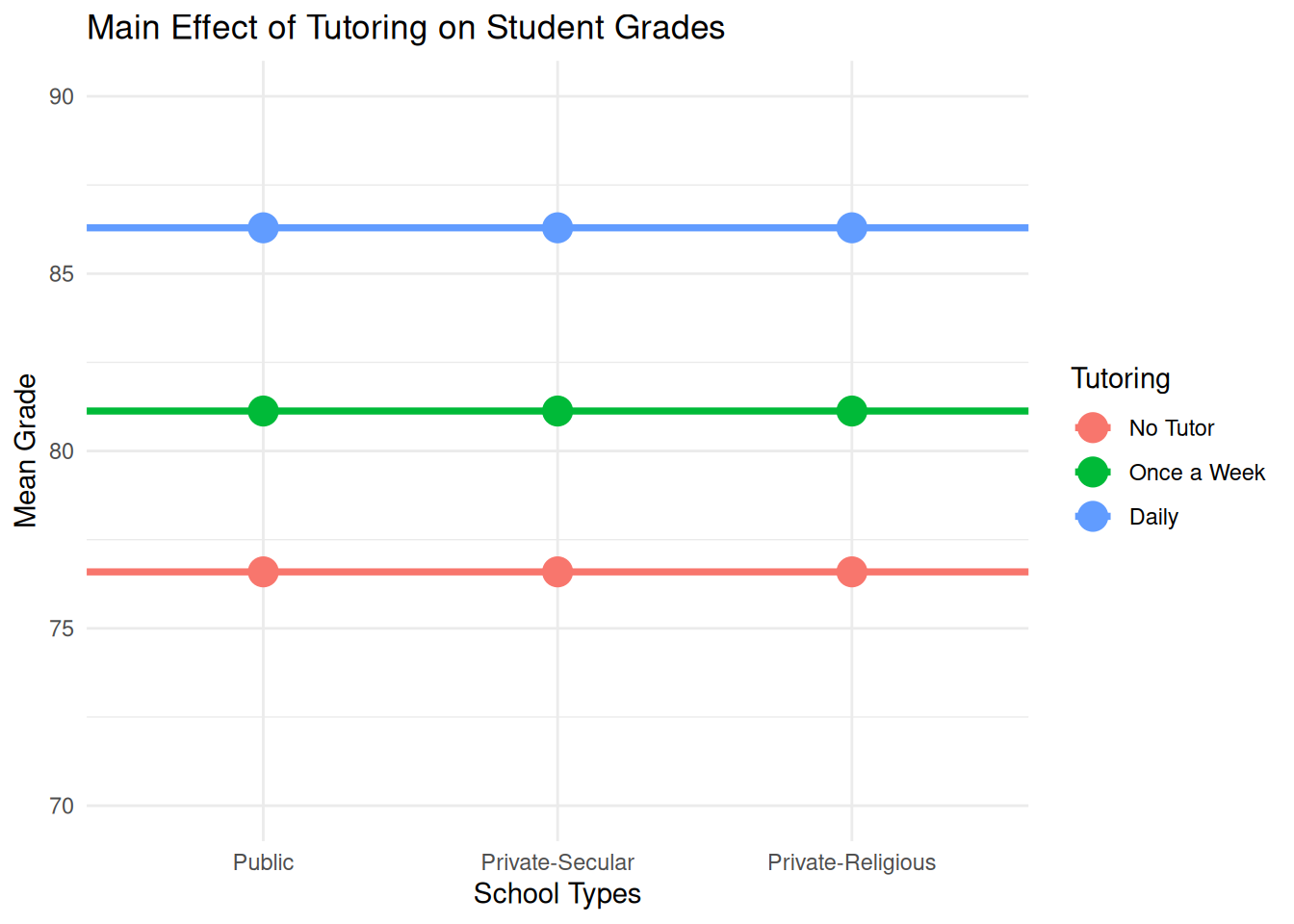 - **Research purpose**: to examine the effect of tutoring program (no tutor, once a week, and daily) AND types of school (e.g., public, private-secular, and private-religious) on the studentsโ grades