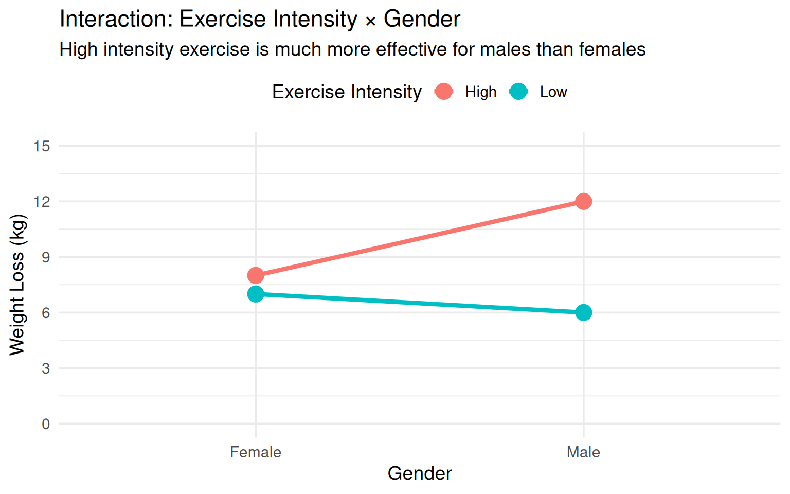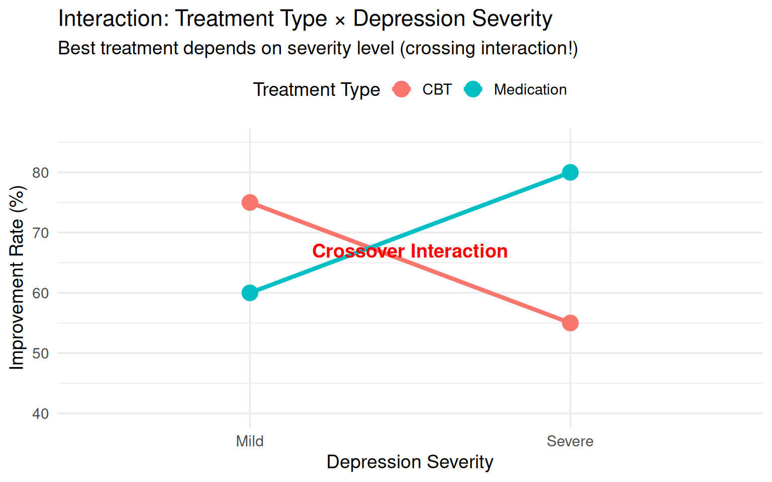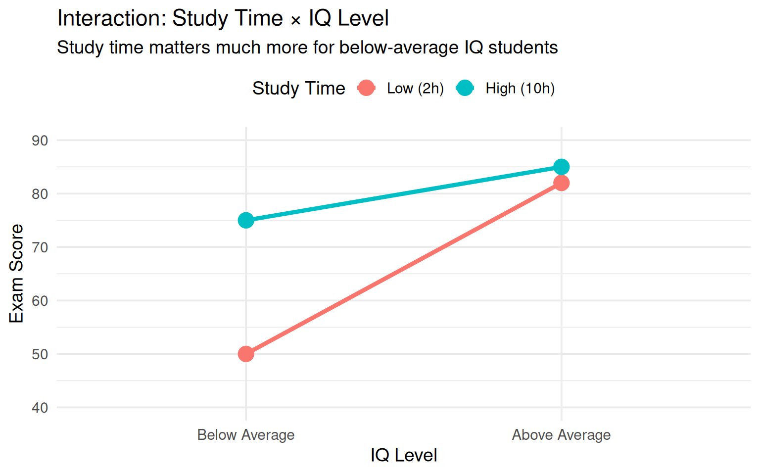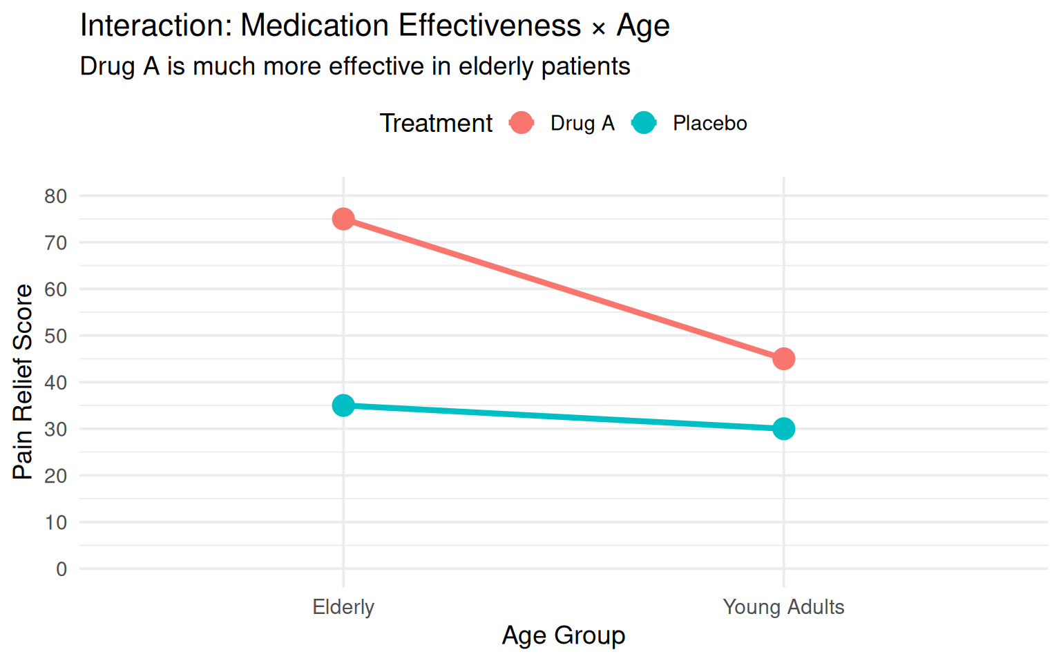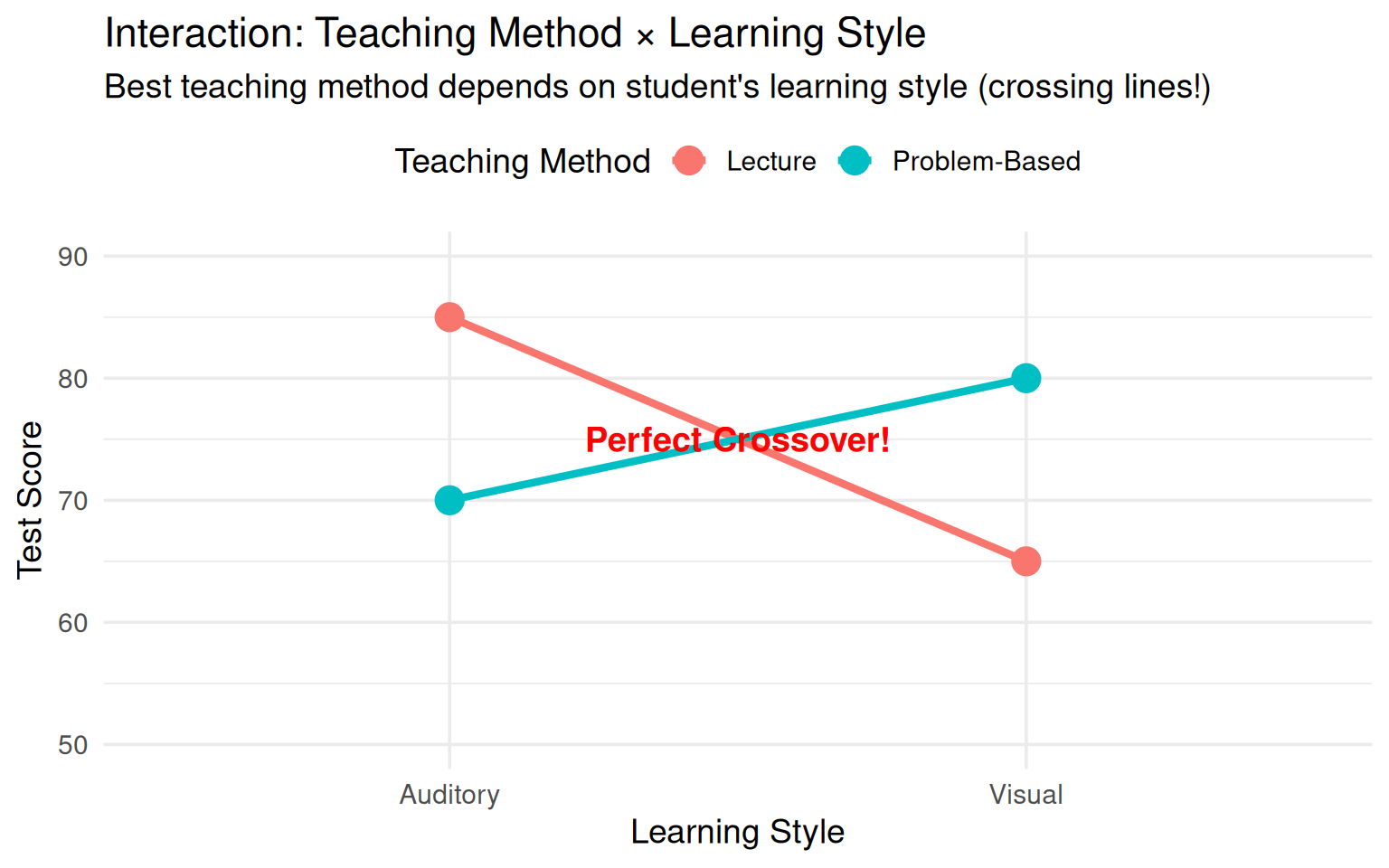 - **Interaction Effect**: When the effect of one factor changes depending on the level of the other factor